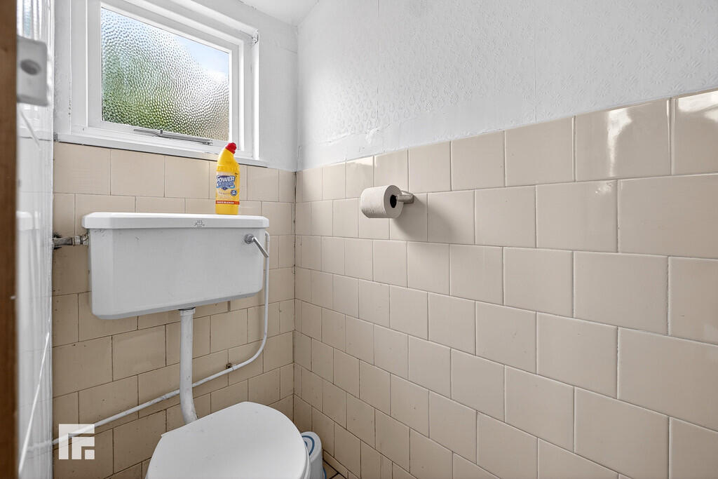WC Continuation of tiled flooring. Partially tiled walls. WC. Pendant light fitting. Obscure window to rear aspect.