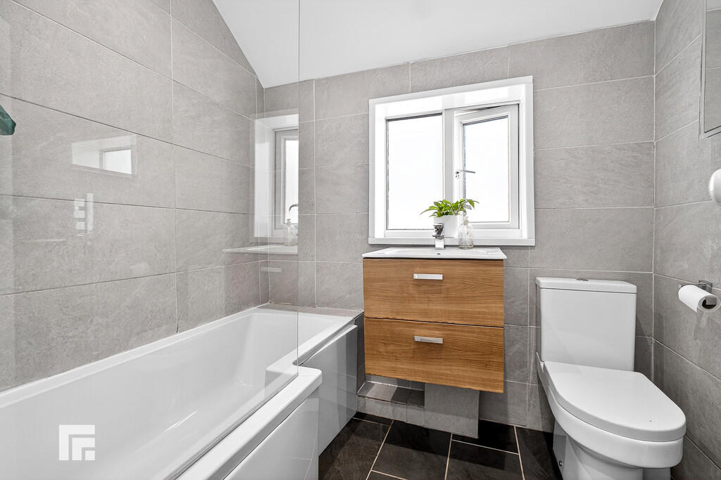 BATHROOM Tiled flooring and walls. White three-piece-suite comprising vanity wash hand basin with mixer tap over, WC, and panelled bath with mains powered shower above. Heated towel rail. Wall mounted mirror. Double glazed uPVC obscure window to side aspect. Spotlights.