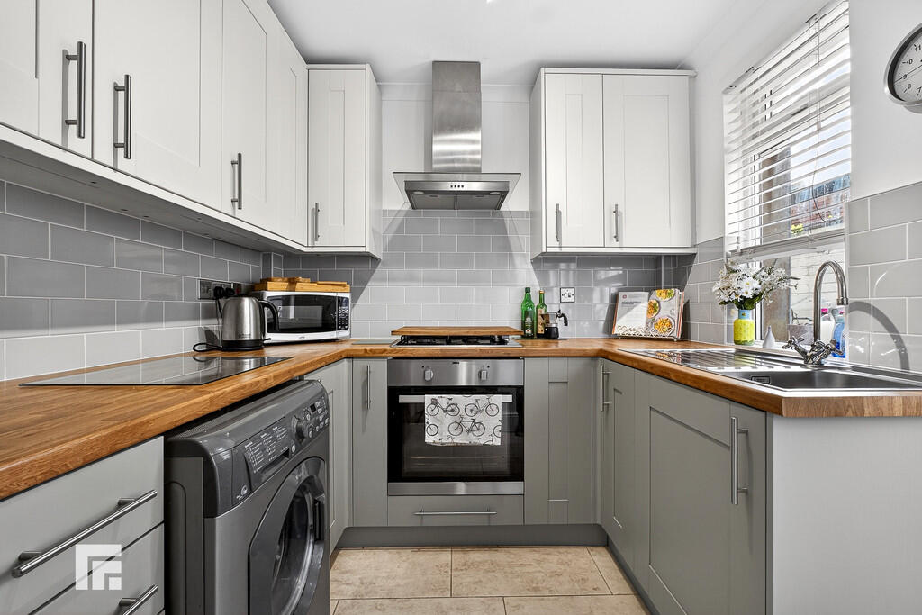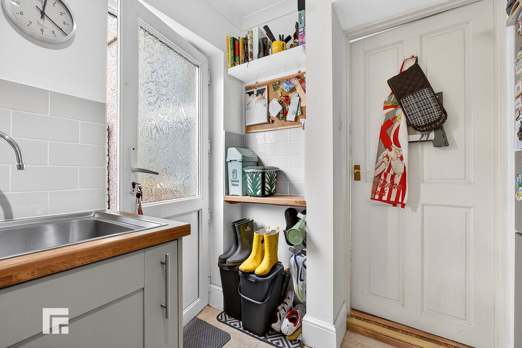 KITCHEN7' 10" x 7' 6" (2.39m x 2.30m) Double glazed upvc window to side. Obscured door to side leading to rear garden. Coved ceiling. Tiled floor. Fitted kitchen comprising base and wall mounted units. Work surfaces and tiled splash-backs incorporating stainless steel sink with mixer tap. Integrated oven and gas hob. Space for washing machine and fridge freezer.
