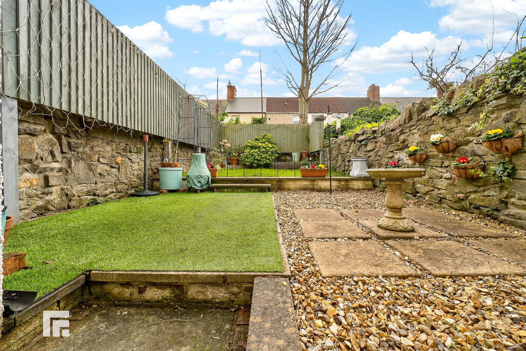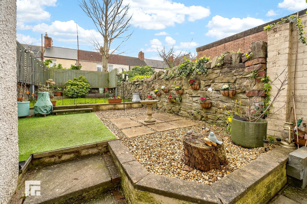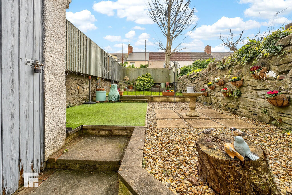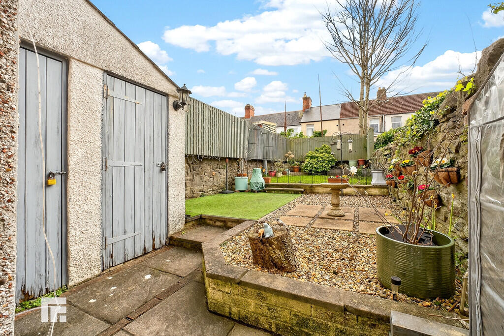 OUTSIDE REAR GARDEN - Bike store and storage shed with power. Outside tap. Paved area with steps to stone chippings and lawn. Raised borders.
