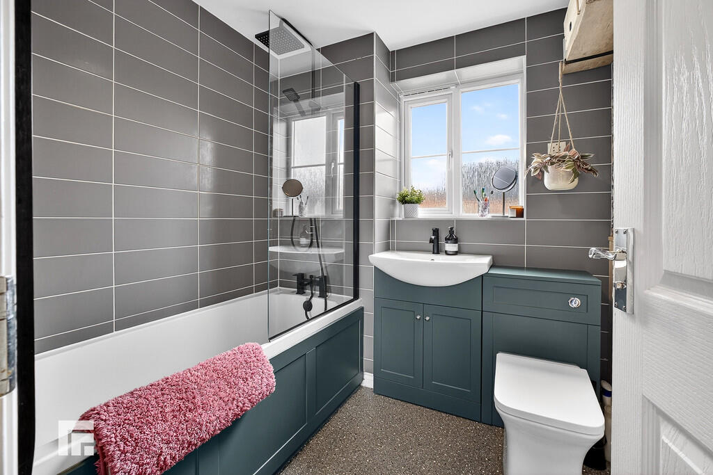 FAMILYBATHROOM6' 7" x 6' 3" (2.02m x 1.91m) Modern white suite; combined low level WC and wash hand basin with black mixer tap and vanity, bath with black mixer tap and black dual headed shower. Tiled walls to three sides. Feature wall with wooden panelling to one wall. Extractor fan. Shaving point. Radiator. Obscured glass window to rear.