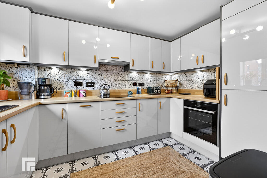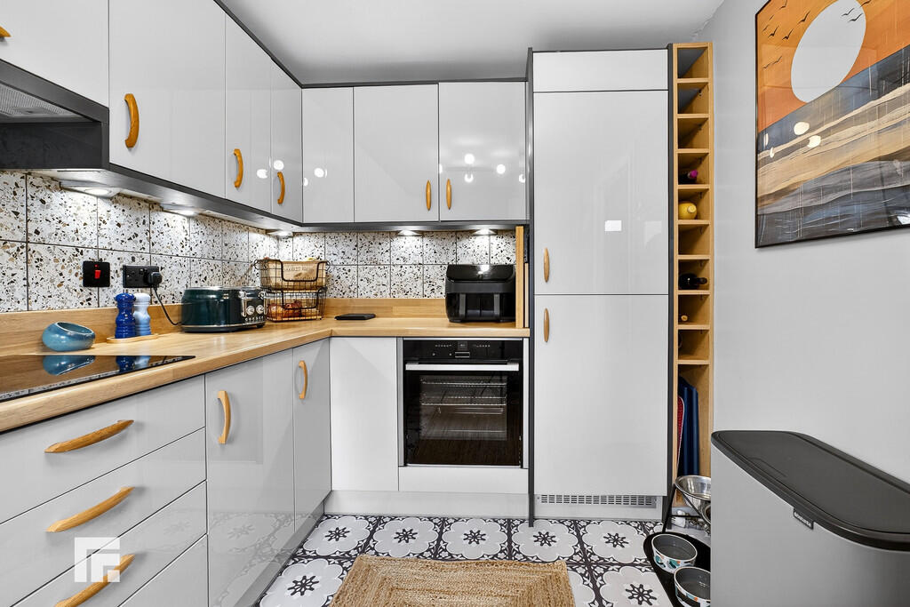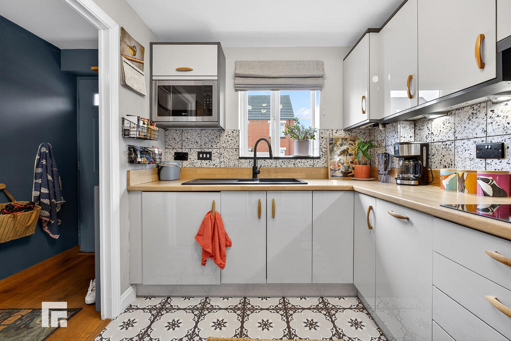 KITCHEN11' 0" x 7' 6" (3.36m x 2.30m) Appointed along three sides, low and high level cupboards beneath quality wood effect laminate worktops, integrated 1.5 bowl black composite sink with black hot/cold mixer tap and side drainer. Integrated four ring induction hob with concealed extractor hood, integrated low level oven, integrated slim line dishwasher, integrated fridge/freezer and integrated washing machine. Built in wine rack. Tiled splashbacks. Patterned vinyl tiled flooring. Integrated microwave. uPVC window to front.