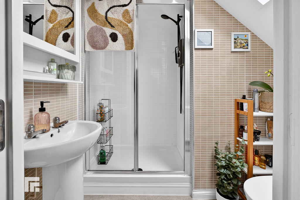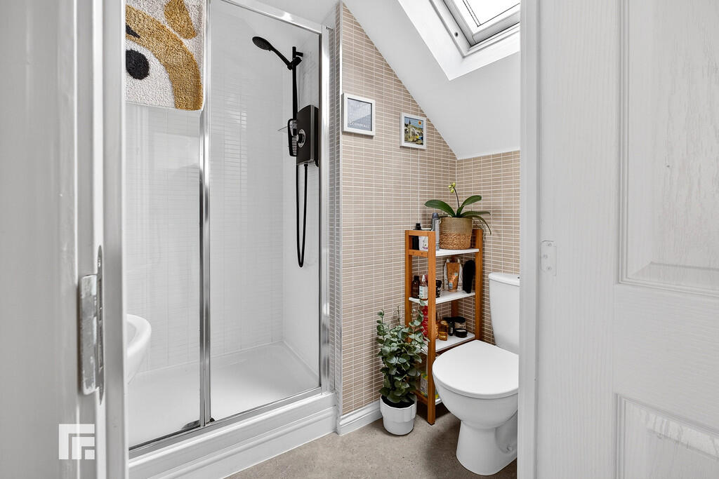 ENSUITE6' 7" x 5' 7" (2.01m x 1.71m) Modern white suite; low level WC, pedestal wash hand basin with twin chrome taps, shower cubicle with black electric shower and glass sliding shower screen. Tiled walls. Radiator. Shaving point. Extractor fan. 'Keylite' window to tear.