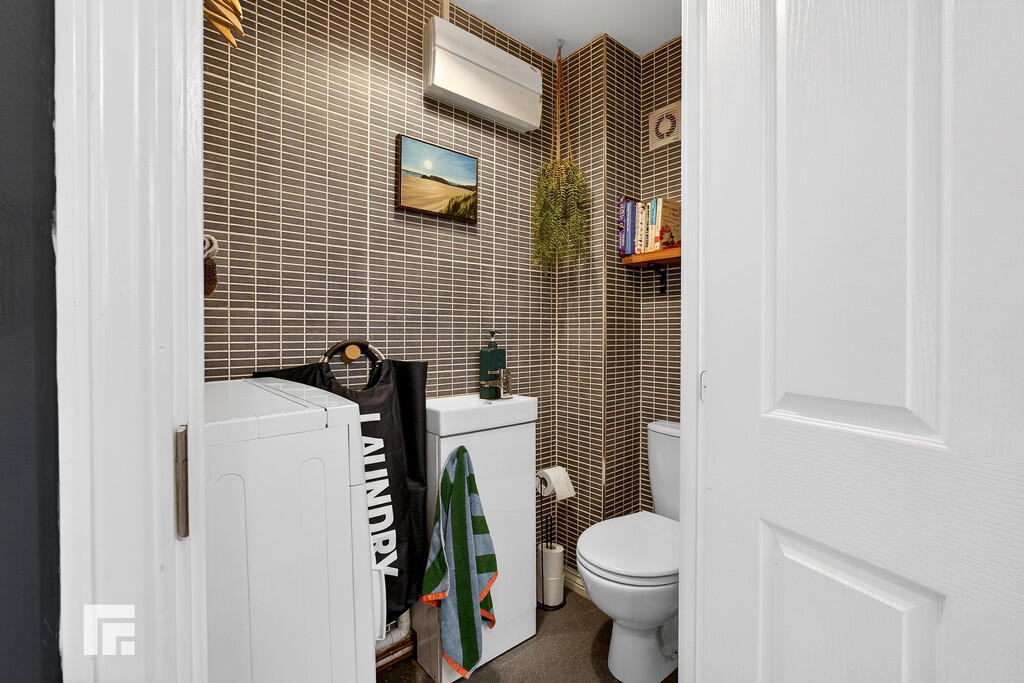 CLOAKROOM6' 3" x 2' 10" (1.92m x 0.88m) Modern white suite; low level WC, wash hand basin with chrome mixer tap and vanity. Extractor fan. Tiled walls.