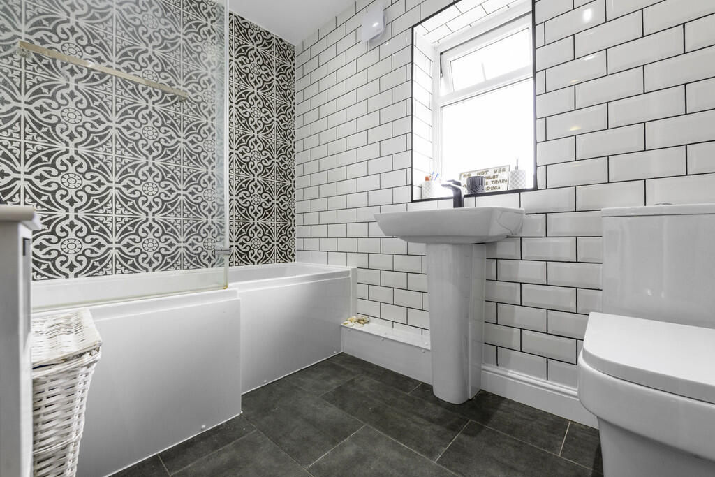 BATHROOM Fitted with a modern three piece bathroom suite comprising 'P shaped' bath with fitted shower screen, wc and wash hand basin. Tiled walls and flooring with smooth ceiling and finished with spot lighting. Upvc double glazed obscure window to rear.