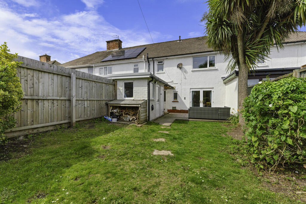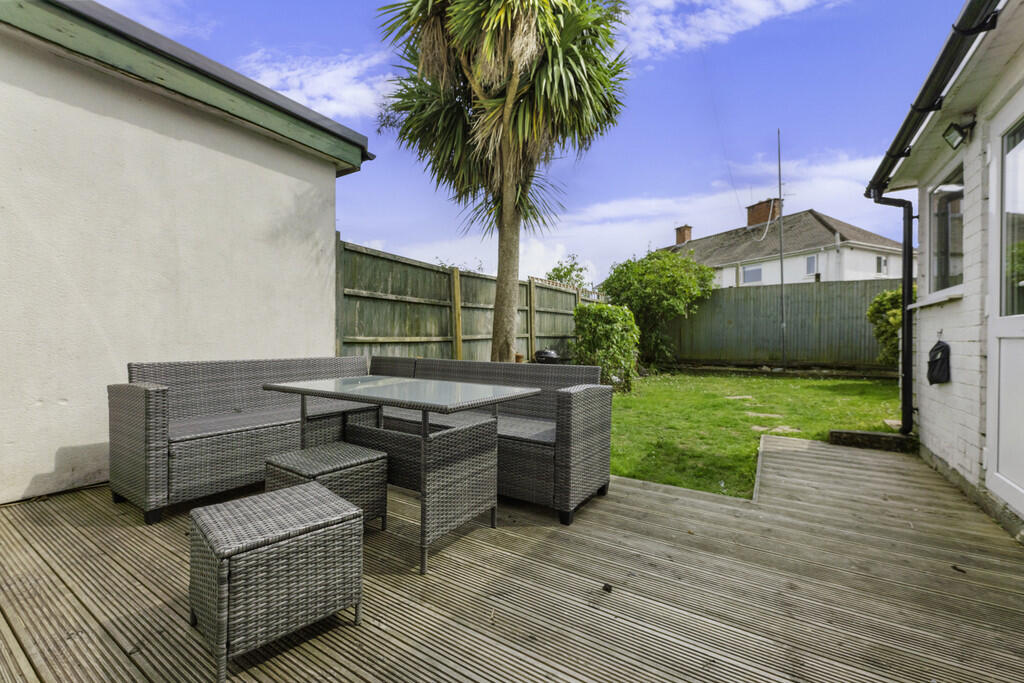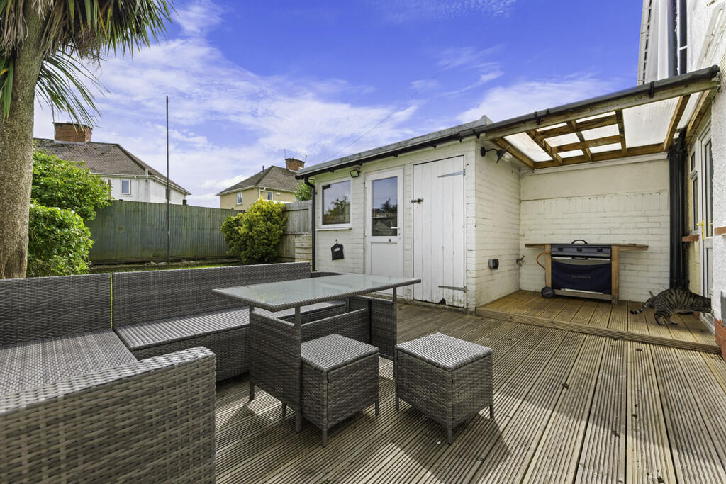 Rear - An enclosed level garden offering a combination of decking and grass with a wooden fence surround with a range of plants and shrubs.