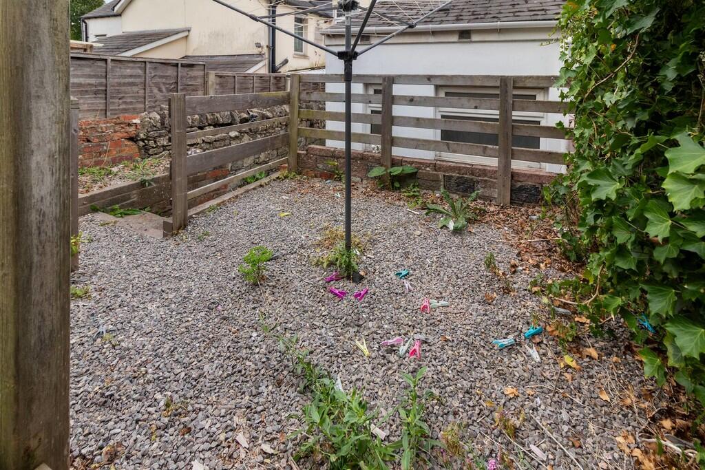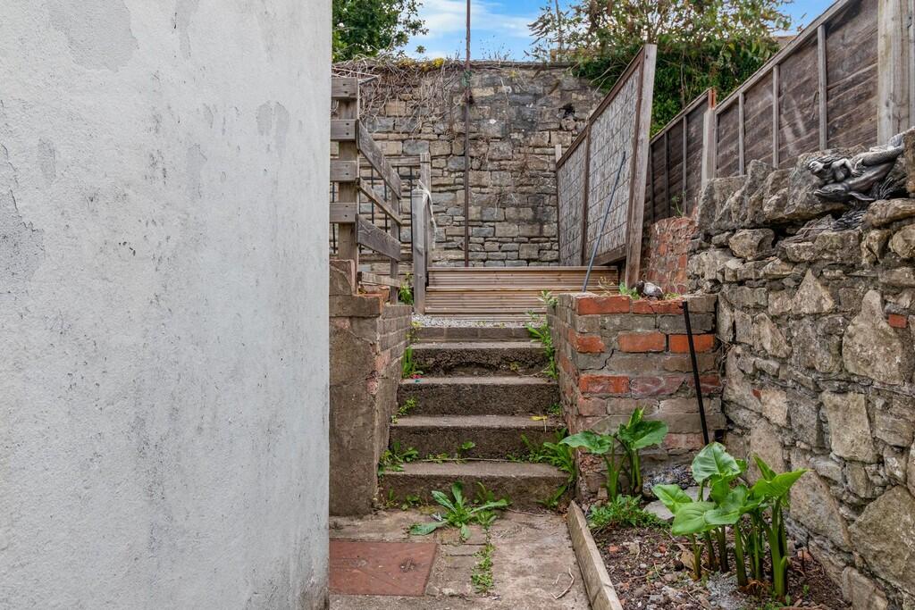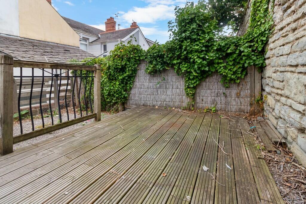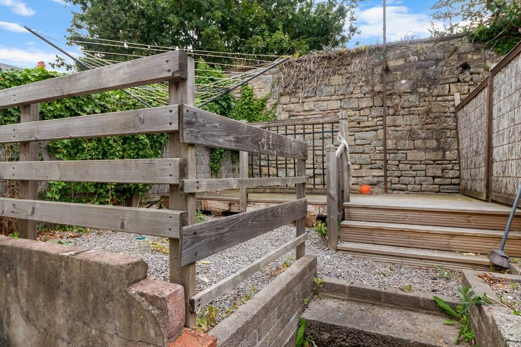 OUTSIDE Low maintenance rear garden laid to laving with steps to a decked area.