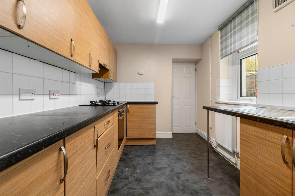 KITCHEN10' 4" x 7' 9" (3.15m x 2.36m) Fitted Kitchen to comprise a range of base and wall units with rolled edge laminated work surfaces incorporating stainless steel sink and drainer with mixer taps over. Built in four burner gas hob and electric oven with extractor over. Recess and plumbing for appliance and space for fridge/freezer. Ceramic tile to splash back areas. Vinyl flooring. Two double glazed windows to the side.