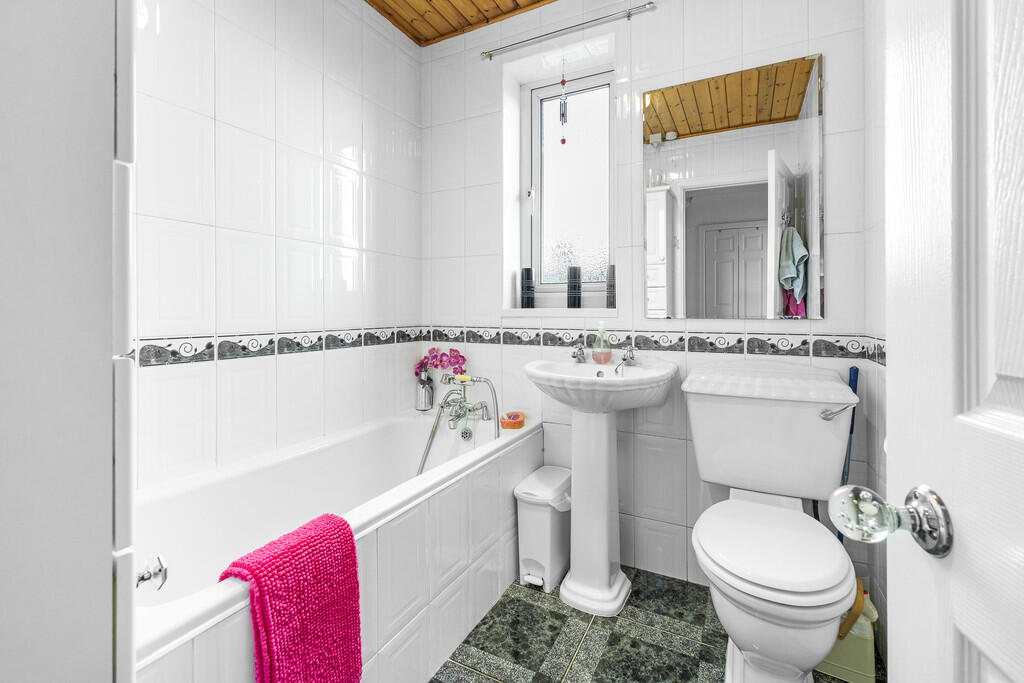 BATHROOM6' 4" x 6' 0" (1.94 m x 1.85m) White suite; low level wc. Wash hand basin with chrome taps. Tiled walls and flooring. Radiator. uPVC double glazing frosted window to rear. Bath tub with chrome taps and shower head. Built in cupboard space above and to side of bath. Wooden panelled ceiling.