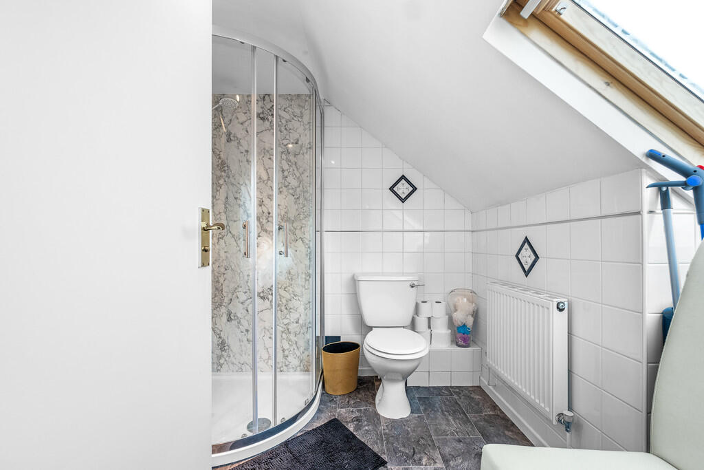 BATHROOM26' 9" x 6' 6" (2.07m x 2.00m) White suite; low level wc. wash hand basin with chrome taps. Laminate flooring. Tiled walls. "Velux" window to rear. Chrome shower with marble walls. Radiator. Spotlights