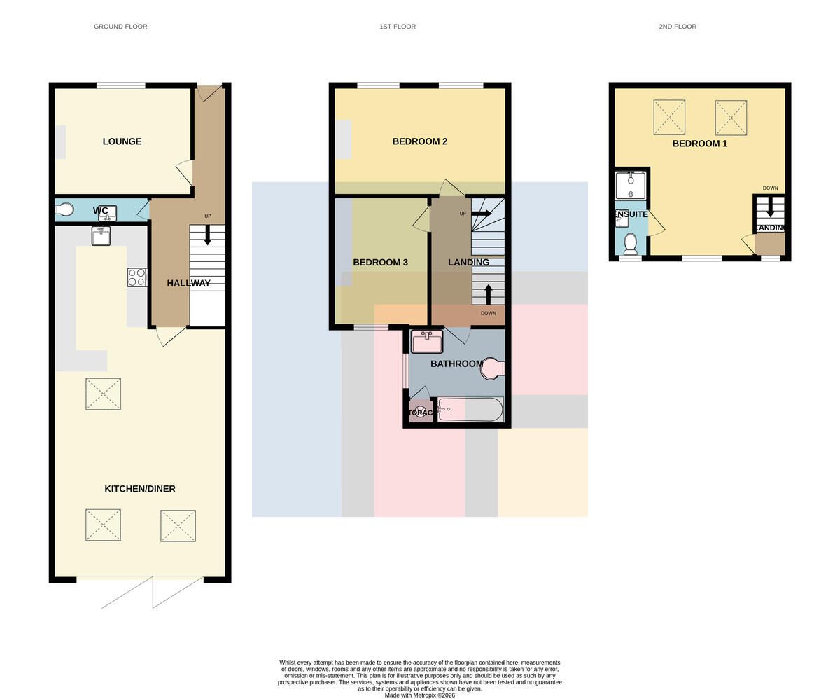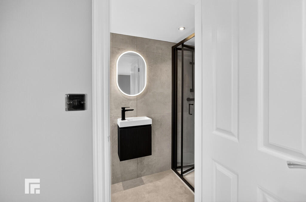 ENSUITE8' 6" x 2' 5" (2.60m x 0.75m) A stylish suite comprising low level WC, vanity enclosed wash hand basin and fitted mains shower cubicle. Fully tiled walls and flooring. Heated towel rail. Extractor fan. Spotlights. Obscure uPVC double glazed window to rear. LED mirror.
