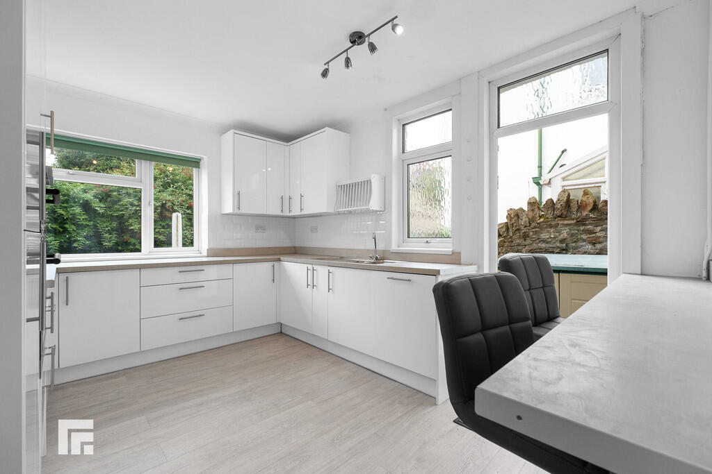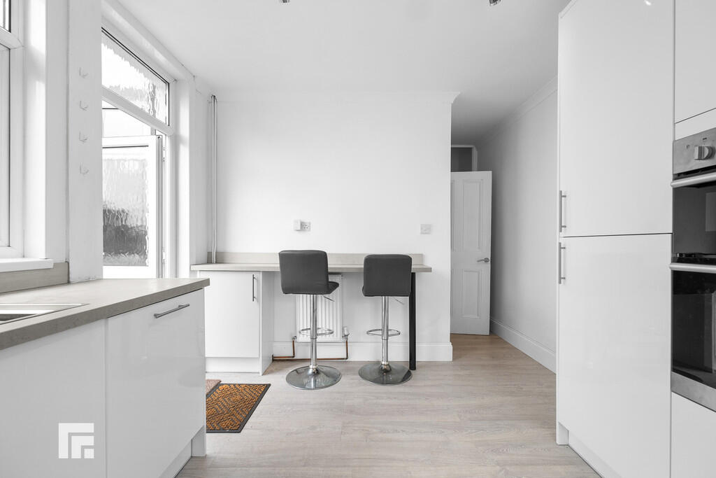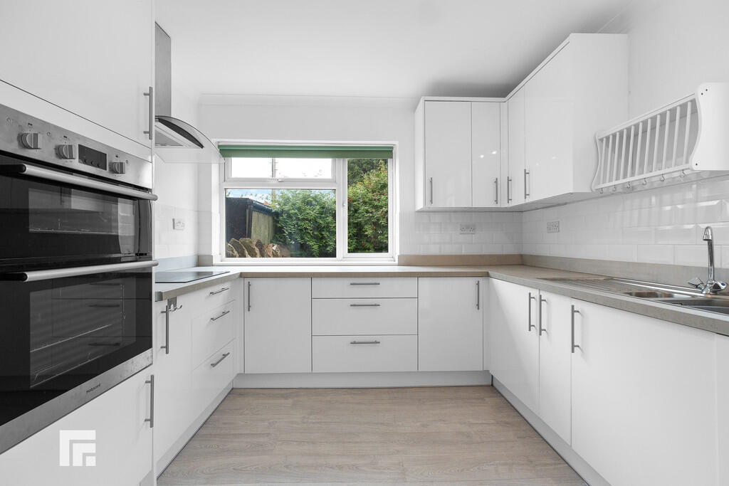 KITCHEN10' 1" x 12' 10" (3.08m x 3.92m) Newly fitted kitchen with two PVC windows, one to rear aspect one to side aspect. PVC door to garden. Range of base and wall mounted cabinets with contrasting square edge countertop. Induction hob with extractor fan over. Tiled splash back with integrated dishwasher, fridge freezer and oven and grill. Radiator.