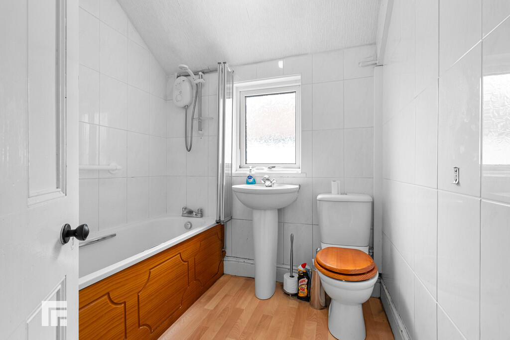BATHROOM6' 7" x 6' 7" (2.01m x 2.02m) PVC window with obscure glass to rear aspect. Tiled walls. Bath unit with showerhead above and fitted handrail, wash hand basin, and WC within inset flush.