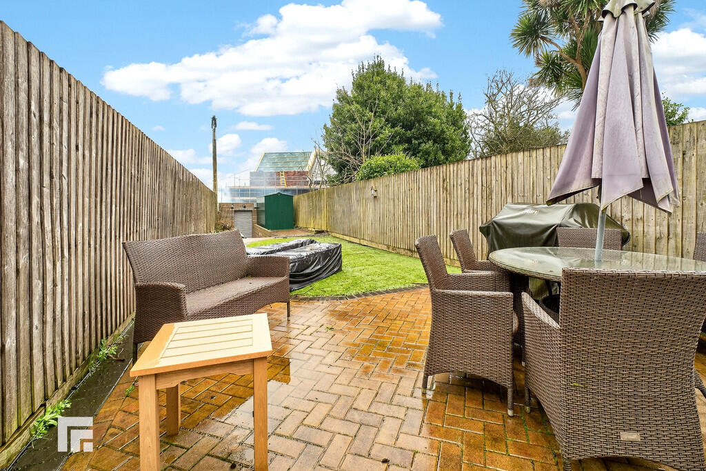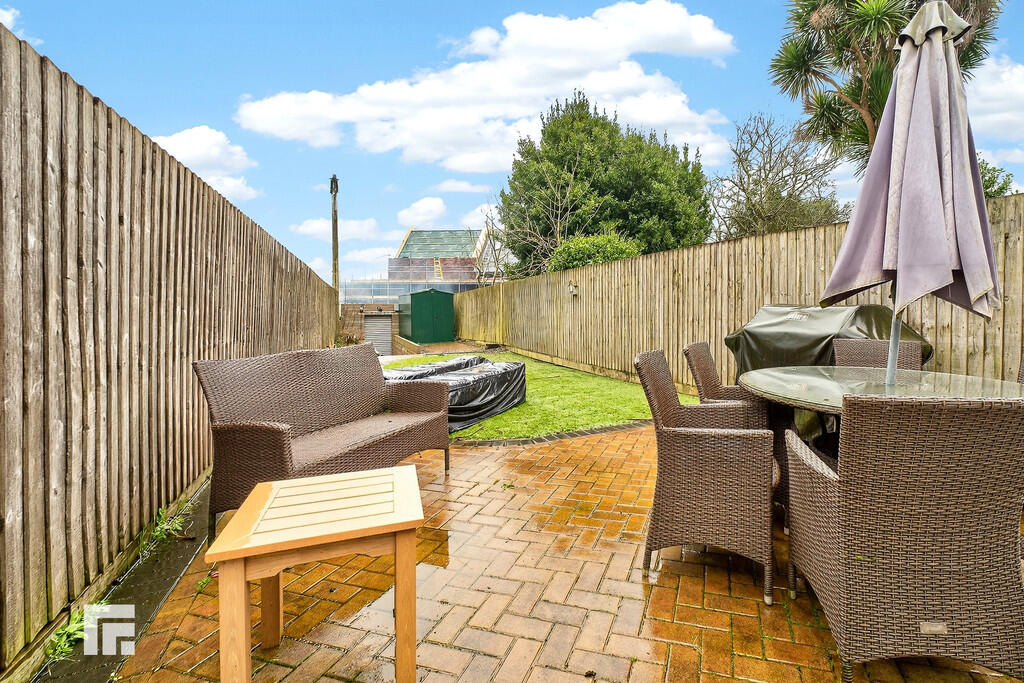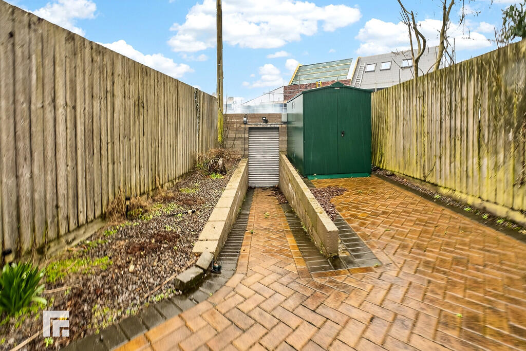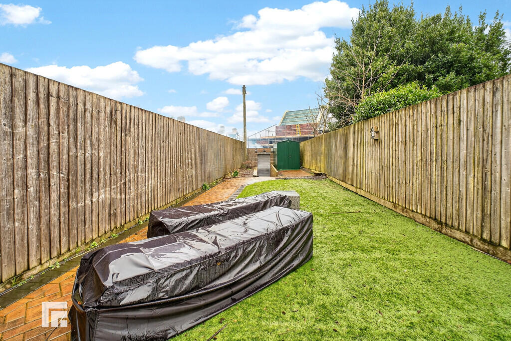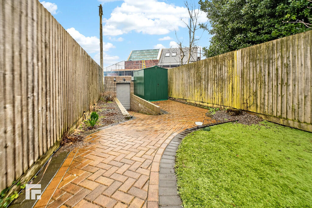 Rear - Southwest facing garden. Laid to patio. Fenced borders. Roller shutter door providing rear lane access. Storage shed. Mature shrubs and flowers. Outside tap.