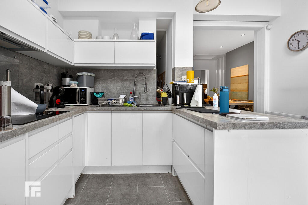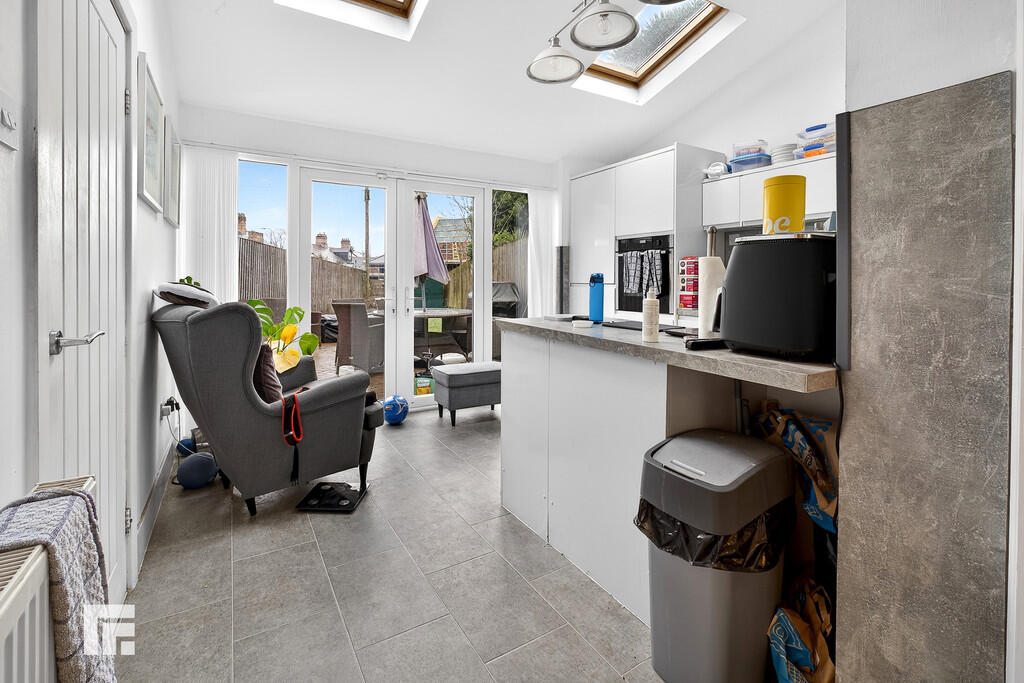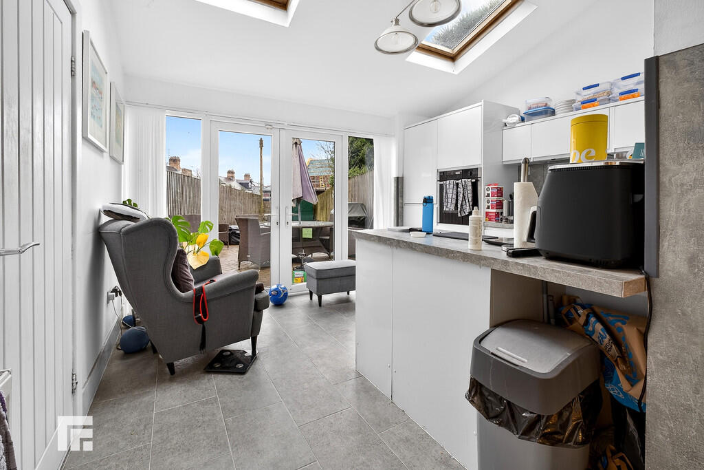 KITCHEN10' 2" x 10' 10" (3.10m x 3.31m) Continuation of tiled effect flooring. Modern fitted kitchen with a range of wall, base and drawer units with worktops over incorporating stainless steel sink and drainer with mixer tap over, integrated fridge freezer, oven with Neff induction hob and extractor hood over. Tiled splashbacks. Two Velux windows. Double glazed uPVC doors leading to rear garden. Pendant light fitting. Door to :-