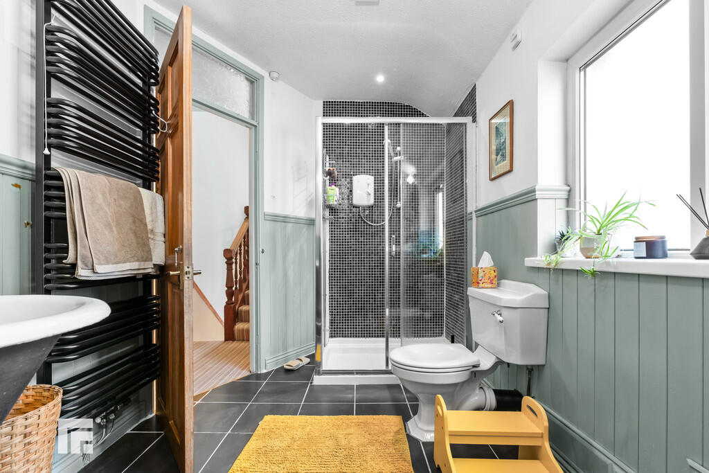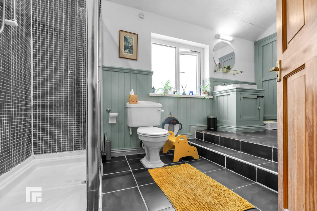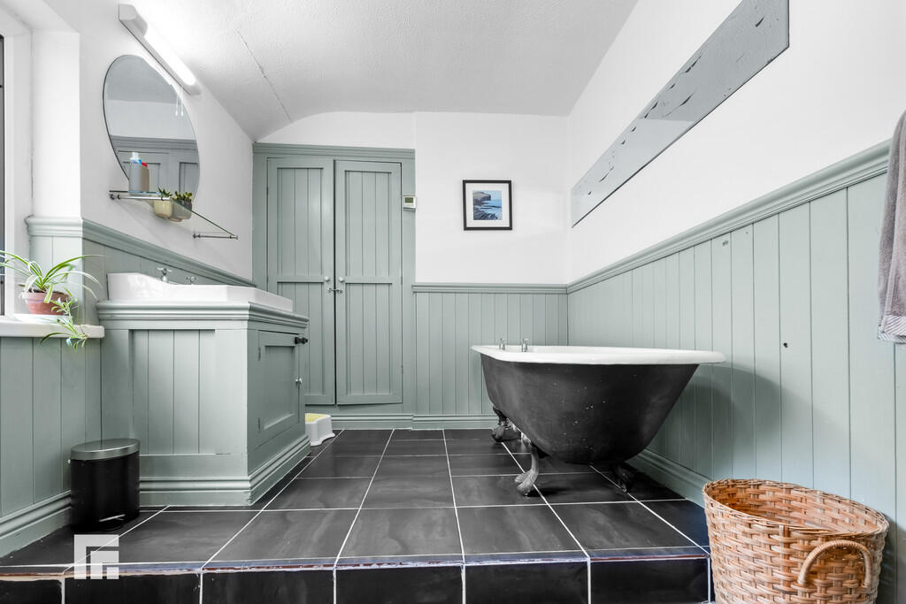BATHROOM13' 2" x 7' 8" (4.02m x 2.34m) Luxurious family bathroom with obscure double glazed window to side aspect. Suite comprising: Low level WC, walk in electric double shower with tiled splashbacks, vanity wash hand basin with hot and cold mixer tap over and vanity cupboard below. Freestanding bath with hot and cold taps and double shower. Contemporary fixtures. Partly panelled walls. Tiled flooring. Spotlights. Fitted cupboard to one wall with ample storage. Wall mounted thermostat. Heated towel rail.