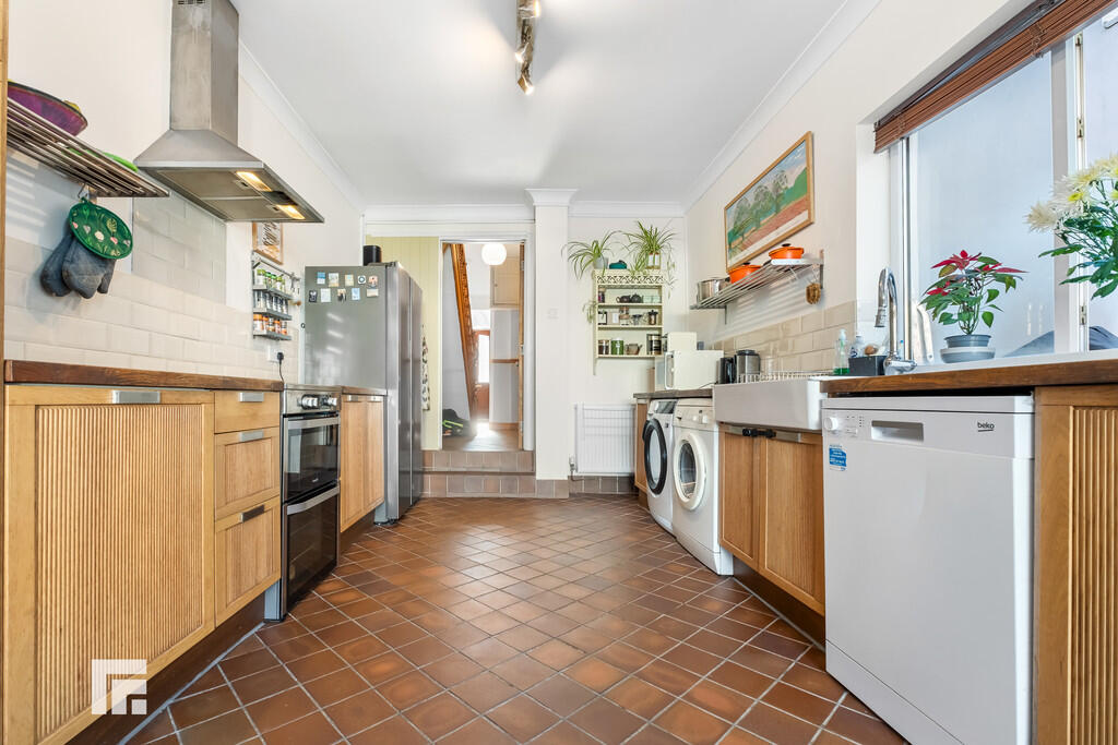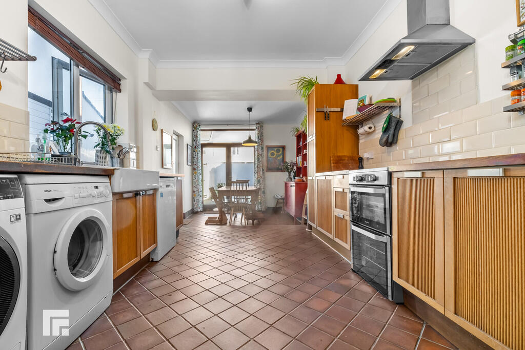 KITCHEN25' 2" x 9' 10" (7.68m x 3.01m) Double glazed uPVC window to side aspect, hardwood French doors leading to rear garden plus additional double glazed uPVC door to side. Fitted wall, base and drawer units with contrasting wooden worktops incorporating inset double sink unit with mixer tap over. Hotpoint oven with four ring electric hob over, tiled splashbacks and extractor fan above. Space for appliances such as: fridge freezer, washing machine and dishwasher. A generous space perfect for family gatherings and entertaining, with French doors to the garden and ample room for dining. Tiled flooring. Coving. Partly tiled walls. Two radiators.