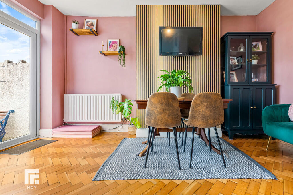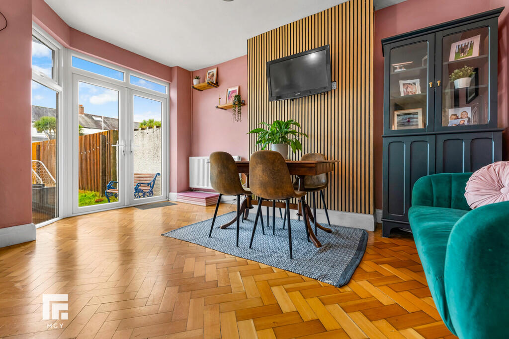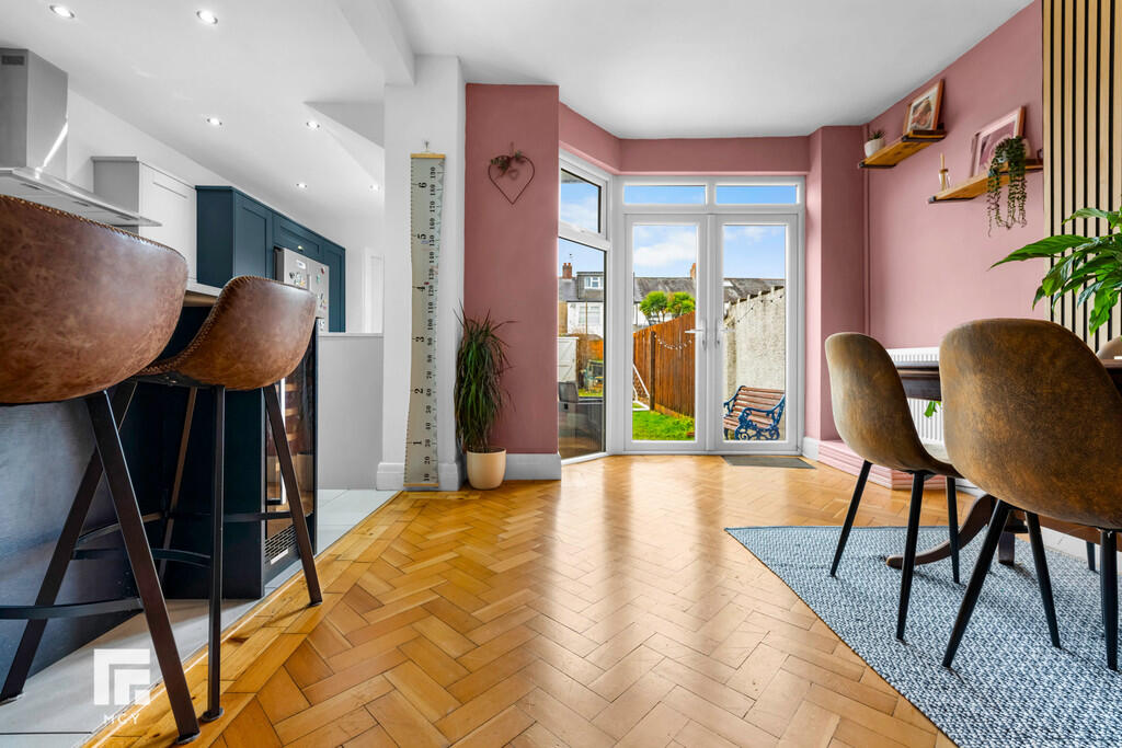 DININGROOM14' 10" into bay x 10' 11" into alcove (4.54m x 3.33m) uPVC double glazed patio doors leading to rear garden. uPVC double glazed panels to side and over. Fan light. Original wood block flooring. Slatted wooden panelling to one wall. Radiator. Shelving to one wall. Opening to:-