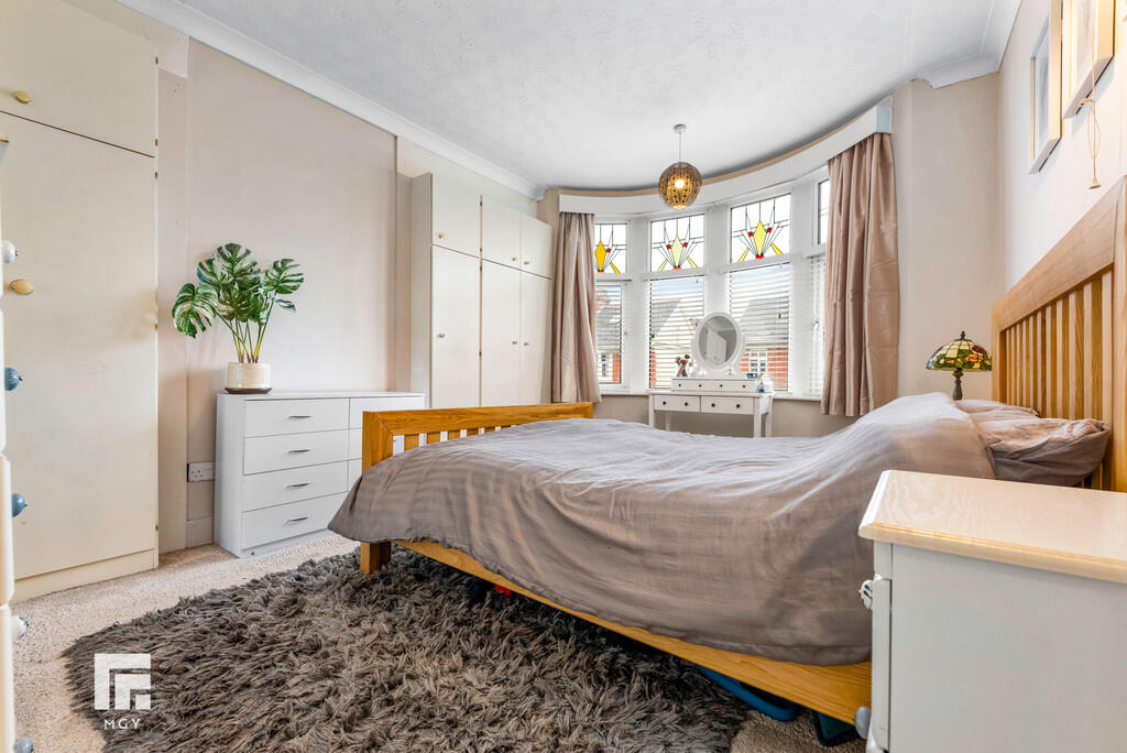 BEDROOMONE14' 4" x 10' 5" (4.38m x 3.20m) uPVC double glazed bay window to front with decorative glazed panels over. Fitted wardrobes with hanging and shelving. Radiator.