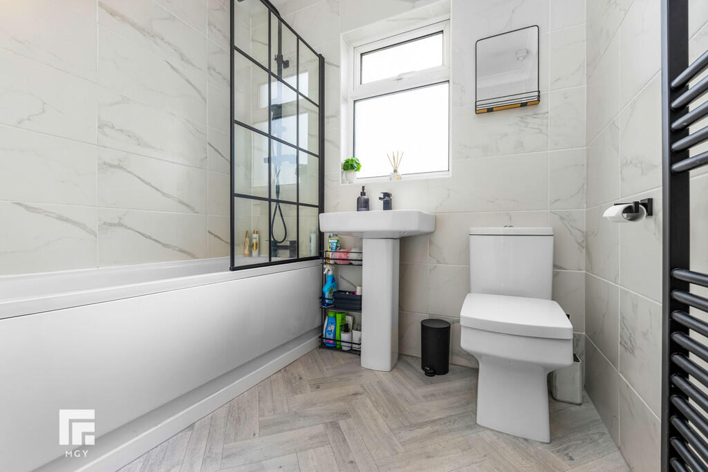 BATHROOM uPVC obscured double glazed window to rear. Tiled walls. Vinyl flooring. 3 piece suite comprising wall hung w.c, pedestal wash hand basin, panelled bath with shower over. Heated towel rail. Storage cupboards to one wall.