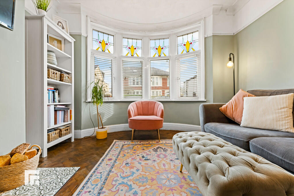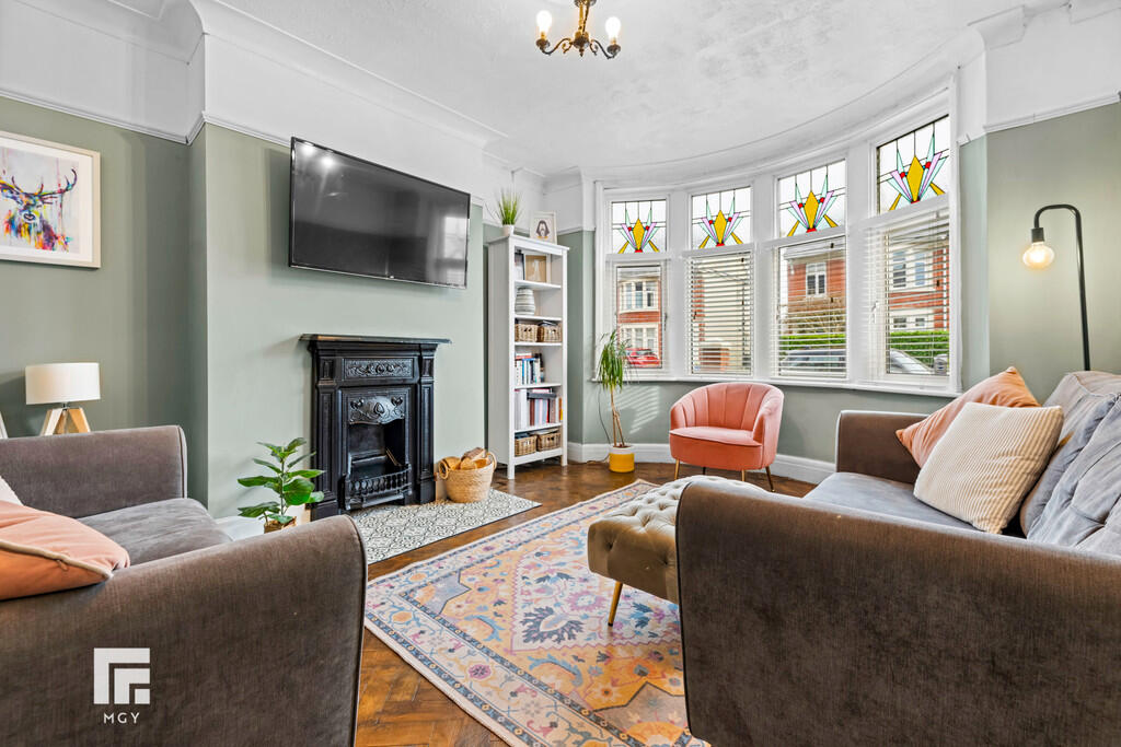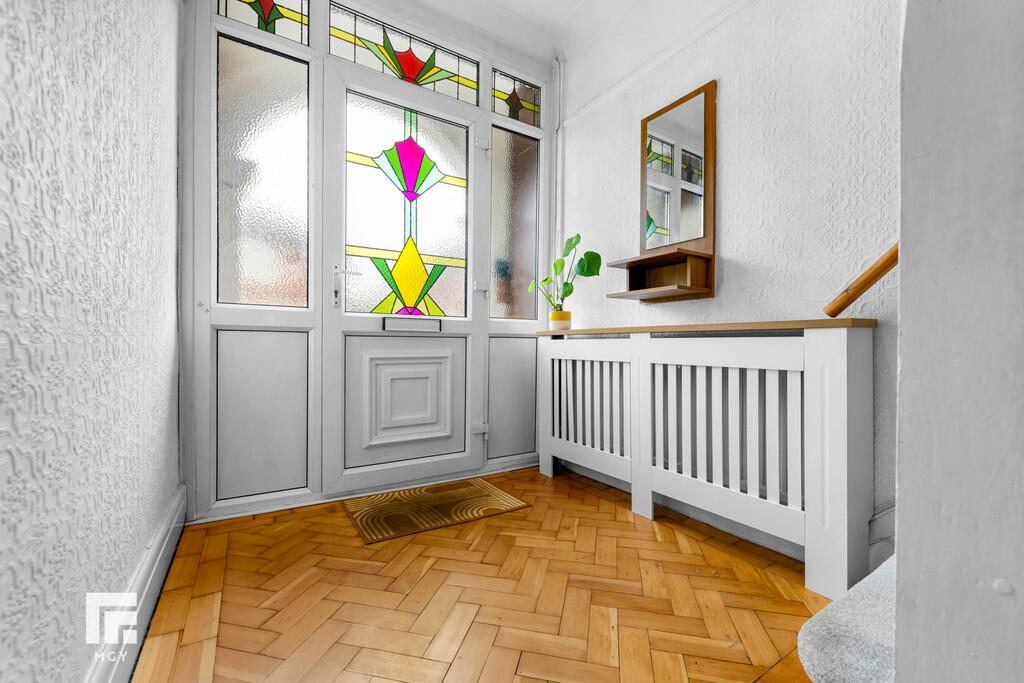 ENTRANCEHALLWAY Entered via uPVC double glazed door with decorative glazed panel inset and over, obscured glazed panels to either side. Original wood block flooring. Picture rail. Radiator with covering. Stairs to first floor with understairs storage. Meter cupboard.