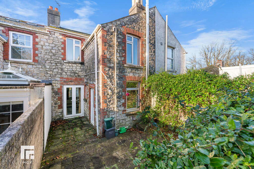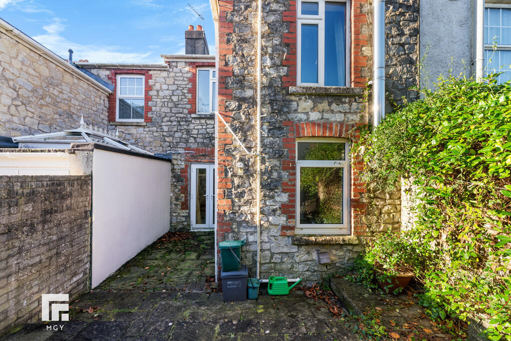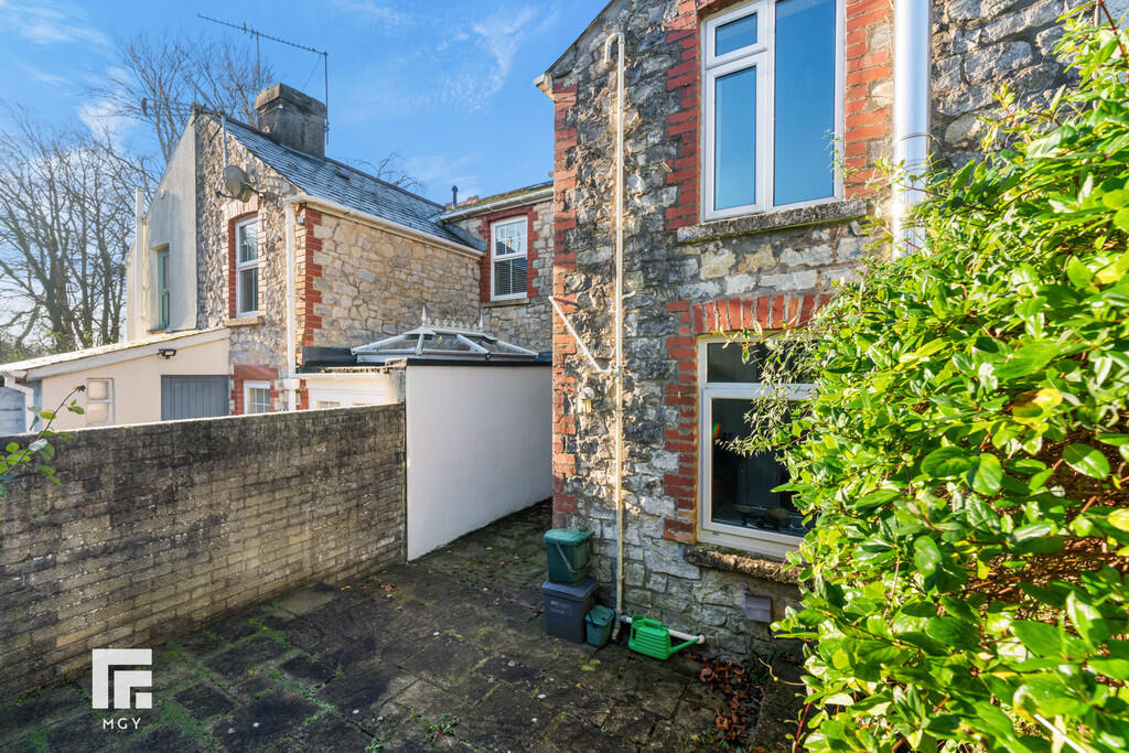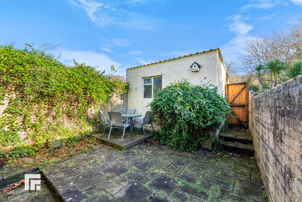 REARGARDEN Paved courtyard garden with pedestrian access to the rear lane. Storage shed which contains the oil storage tank. Access to the rear workshop.