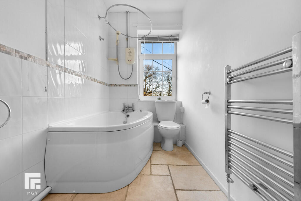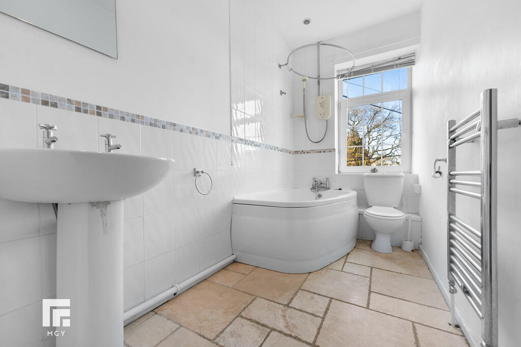 FAMILYBATHROOM9' 9" x 5' 0" (2.97m x 1.52m) White suite including panelled bath with electric shower over, low level WC and pedestal wash hand basin, fitted wall shelving, recessed lighting and double-glazed window to front.