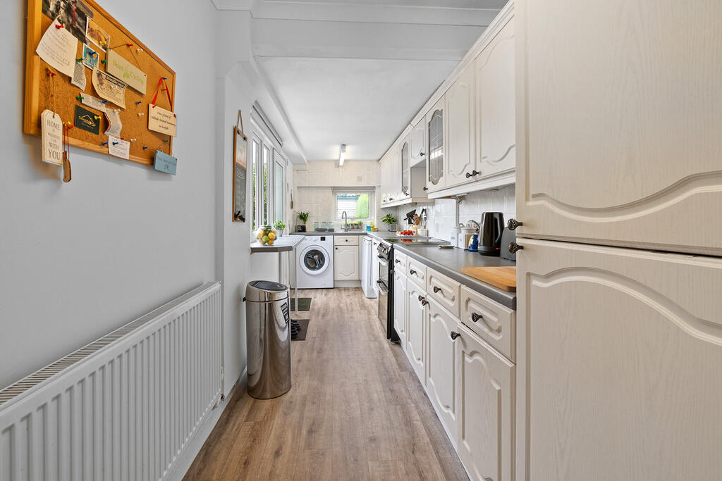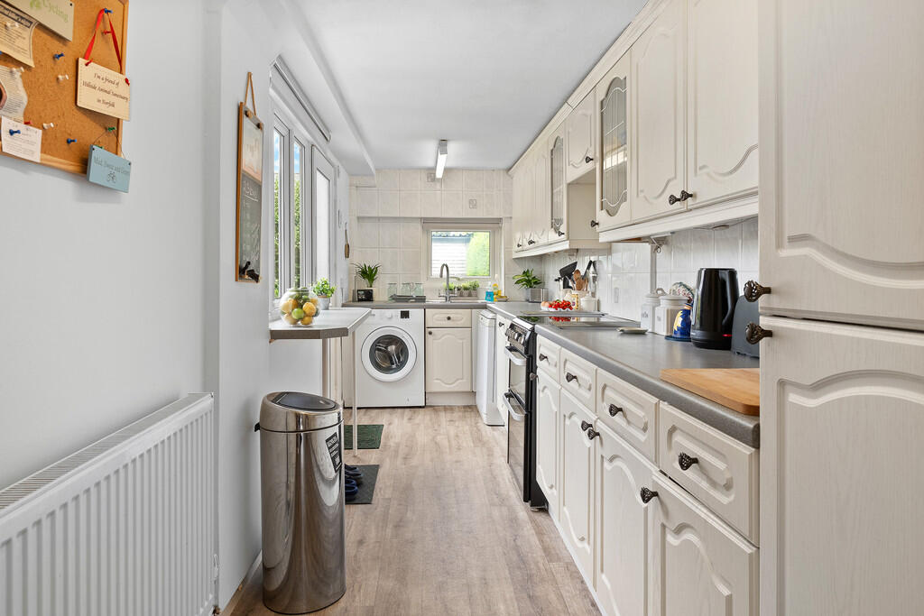 KITCHEN5' 11" x 21' 3" (1.816 m x 6.492 m) Entry via wooden door with glass pane:- A range of base and wall mounted cabinets with contrasting round edge countertops. Integrated fridge freezer. Plumbing and space for washing machine and dishwasher. PVC door to rear garden. Two PVC windows to rear aspect. Strip lighting. Radiator. Tiled walls. Countertop breakfast bar unit.
