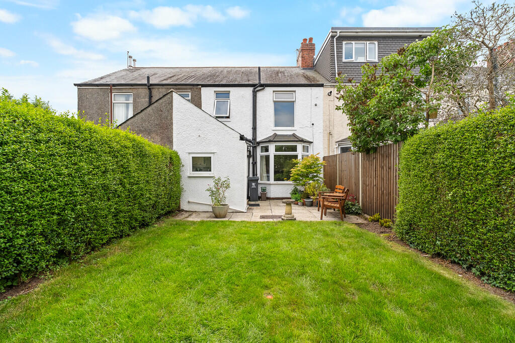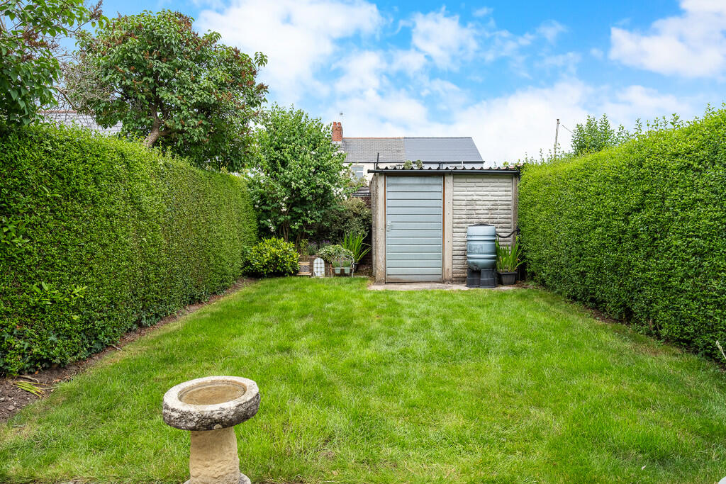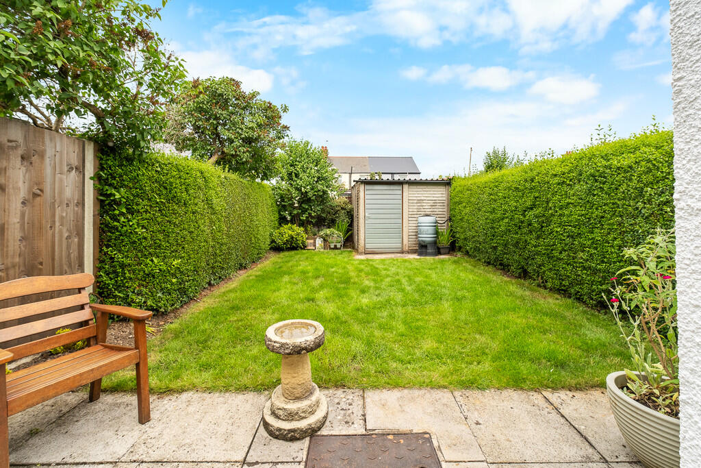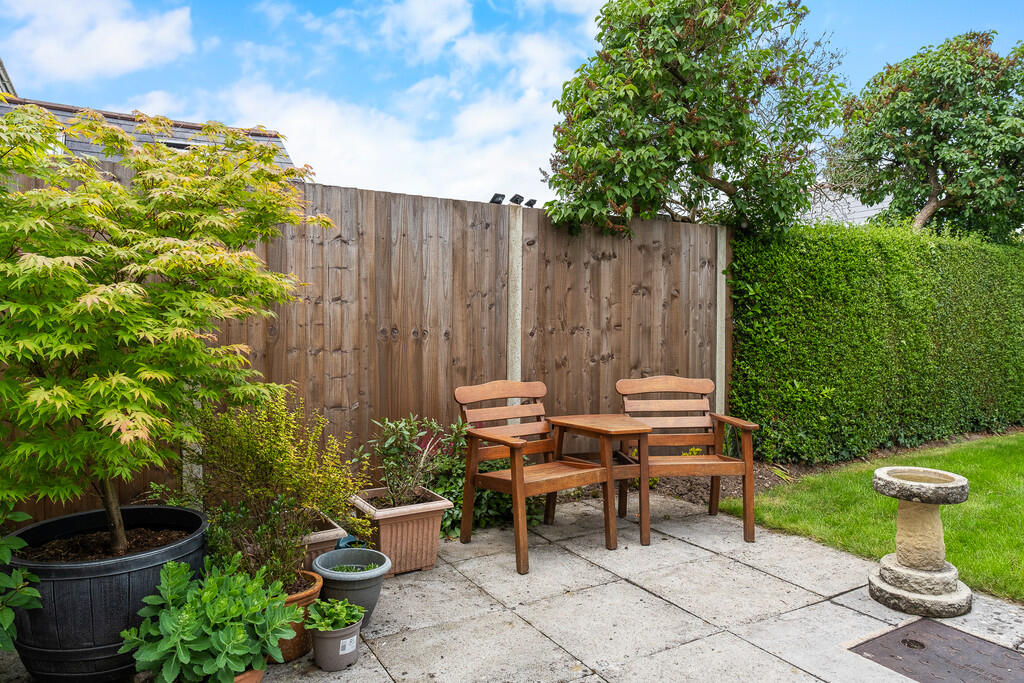 Rear - Patio sitting area. Lawn area. A mixture of mature shrubs and trees. Fenced to boundary.