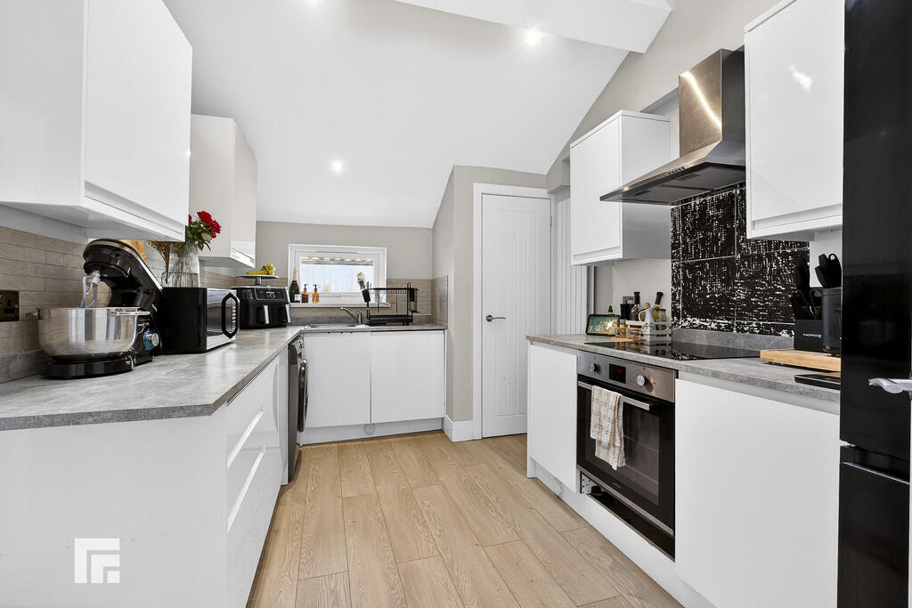 KITCHEN8' 06" x 12' 07" (2.59m x 3.84m) Laminate flooring. Double glazed opaque door to rear. Fitted wall and base units incorporating stainless steel drainer with mixer tap over, Recess and plumbing space for appliances, space for fridge/freezer. 4 ring burner electric hob. Double glazed window to the rear.