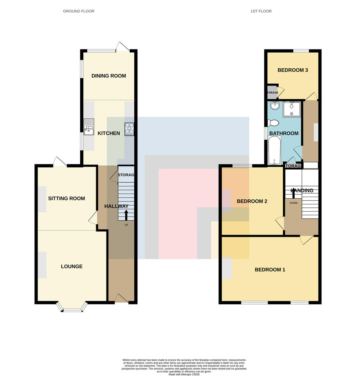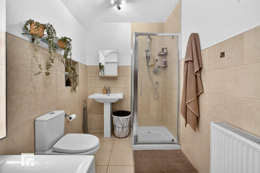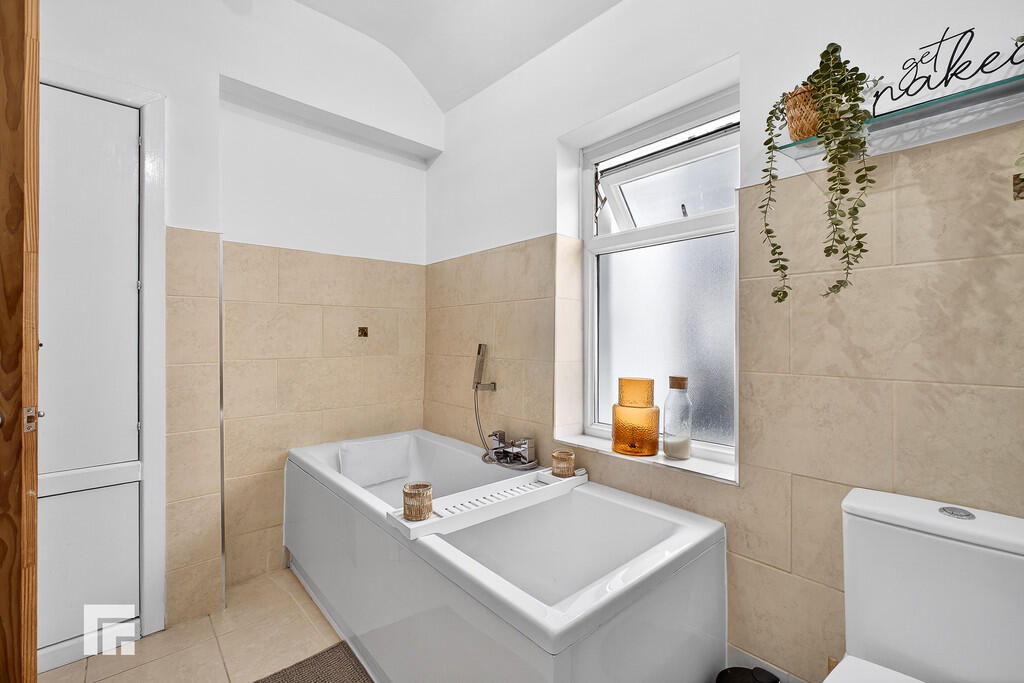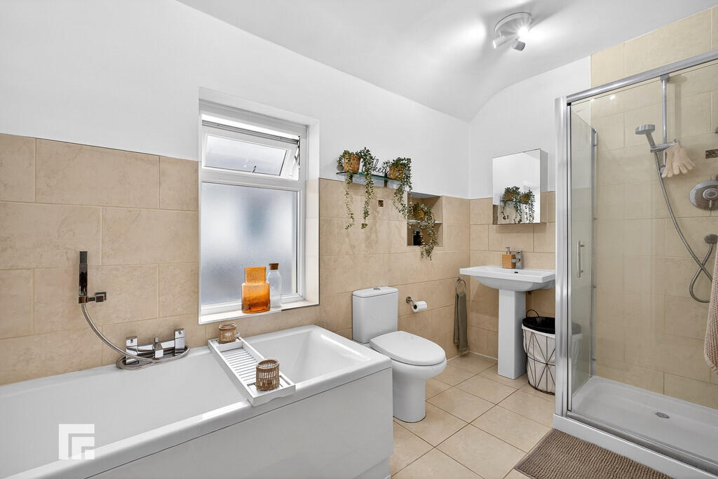 BATHROOM9' 8" x 7' 7" (2.97m x 2.32m) Obscure double glazed window to side aspect. Panelled bath with additional handheld shower attachment. Shower cubicle with glass doors and mains shower over. Pedestal wash hand basin with mixer tap above and fitted vanity mirror over. WC. Pendant light fitting. Partly tiled walls and tiled flooring. Fitted cupboard with ample storage space. Radiator.