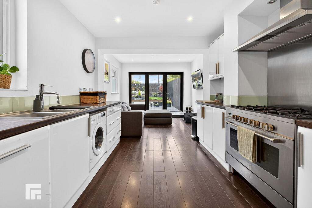 KITCHEN/DININGROOM11' 10" x 19' 3" (3.63m x 5.88m) Double glazed windows to side aspect and additional bifold doors to rear. Fitted wall, base and drawer units across two walls with contrasting wooden worktops incorporating double stainless steel sink unit with mixer tap over. Space for range style cooker with stainless steel splashback and extractor fan above. Integrated dishwasher and plumbing for washing machine. Ample space for seating/dining. Space for American fridge freezer. Wooden flooring. Radiator. Patio with 'lift and slide' doors open out into the rear garden.