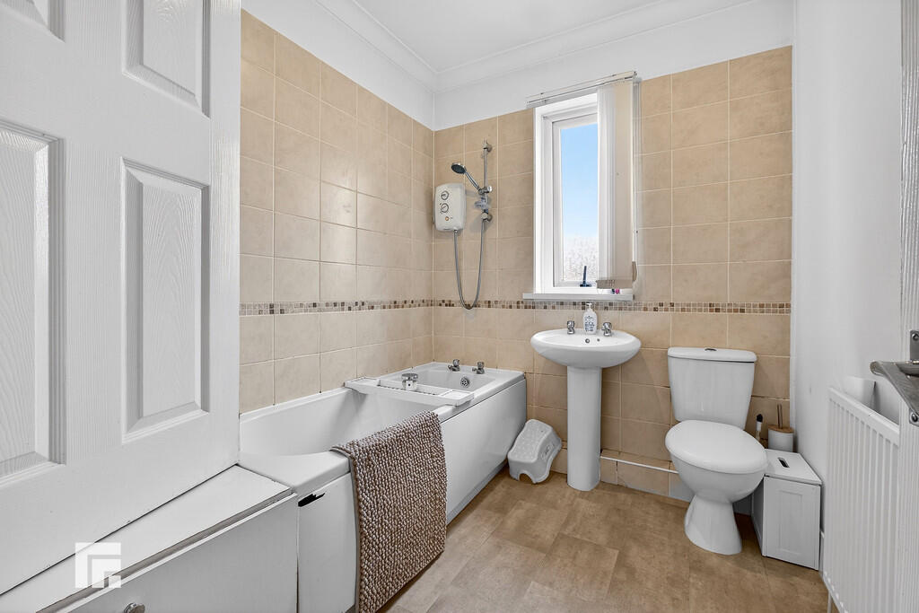 BATHROOM Double glazed opaque window to the rear, a radiator, and vinyl flooring. A panelled bath with shower over pedestal, a hand wash basin and closed cistern WC, ceramic tile to splash back, vinyl flooring. A cupboard housing gas combination central heating boiler.
