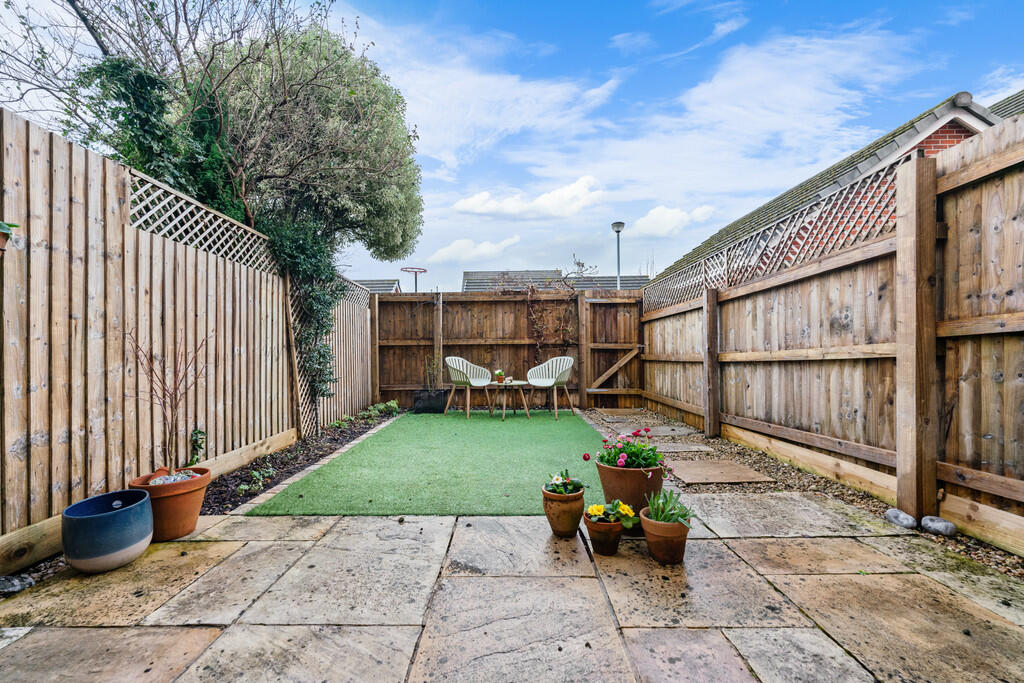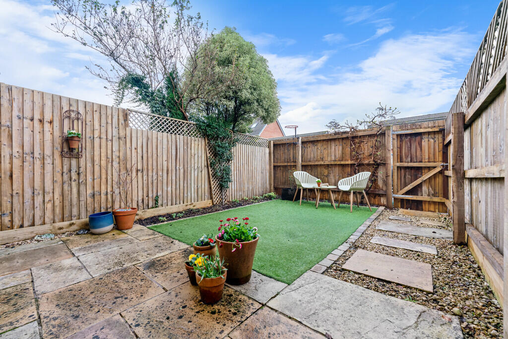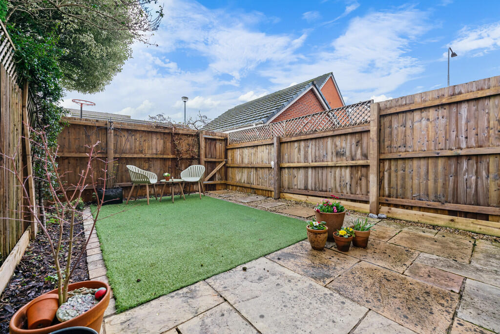 REARGARDEN Landscaped with artificial lawn, paved patio and shrub borders. Boundary fence with gate to parking space and single garage.