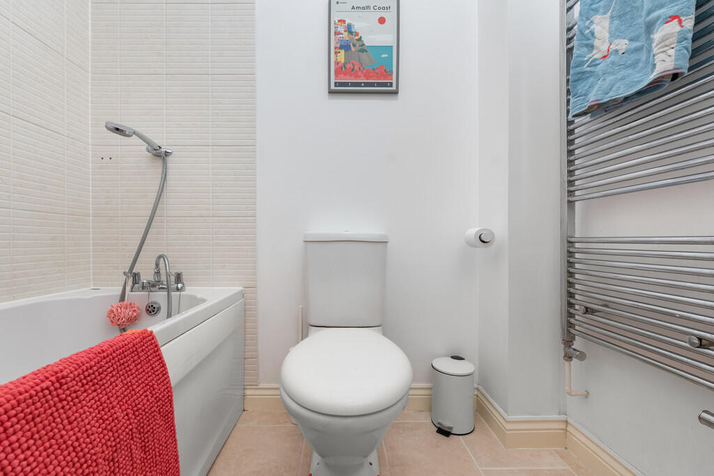 BATHROOM6' 4" x 5' 6" (1.95m x 1.68m) A white suite to include low level WC, vanity enclosed wash hand basin and panelled bath with shower attachment. Tiled splash backs and flooring. Ladder radiator. Extractor fan.