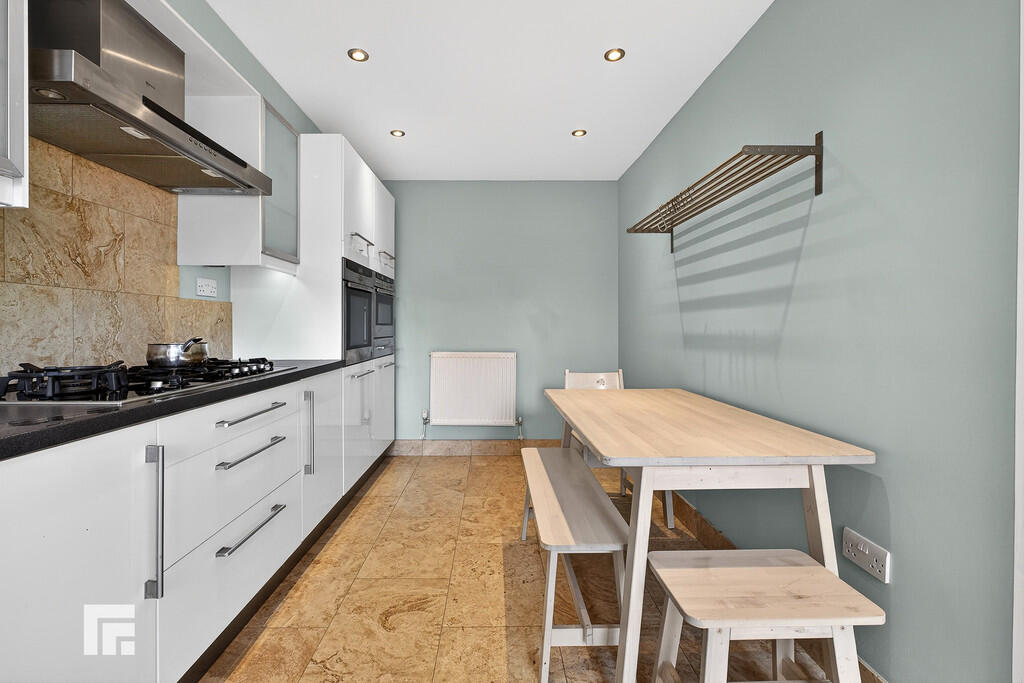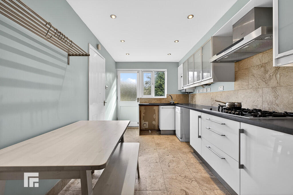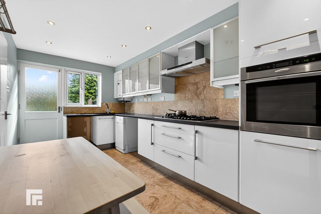 KITCHEN15' 10" x 8' 0" (4.83m x 2.44m) Large fitted kitchen with a range of wall, base and drawer units with worktops over incorporating stainless steel sink and drainer with mixer tap over and four ring gas hob with extractor hood above. Tiled flooring. Part tiled walls. Integrated oven. Space for dishwasher and washing machine. Space for fridge freezer Spotlights. Storage cupboard housing Combi-boiler. Door to;