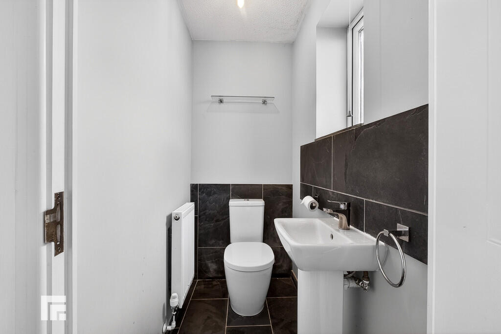 WC4' 1" x 3' 2" (1.26m x 0.97m) Tiled flooring. W.C. Pedestal wash hand basin with mixer tap over and tiled splashback. Pendant light fitting. Double glazed obscure uPVC window to side aspect.