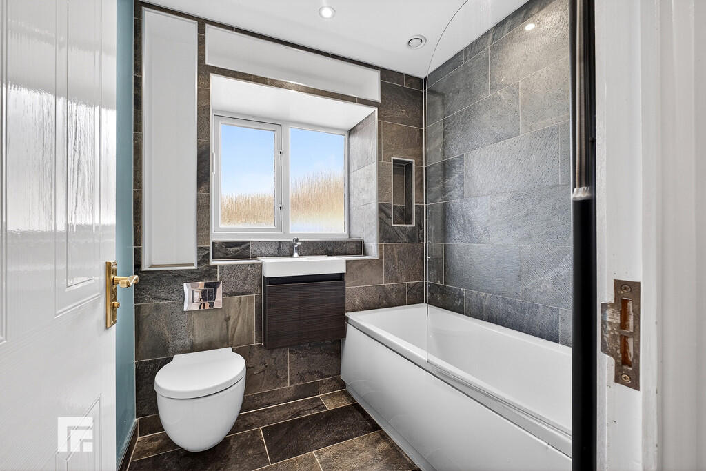 BATHROOM7' 2" x 6' 1" (2.19m x 1.87m) Modern bathroom. Floor to ceiling tiles. White three-piece-suite comprising W.C, pedestal wash hand basin with mixer tap over and panelled bath with shower over. Extractor fan. Spotlights. Double glazed obscure uPVC window to front aspect.