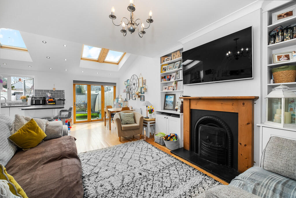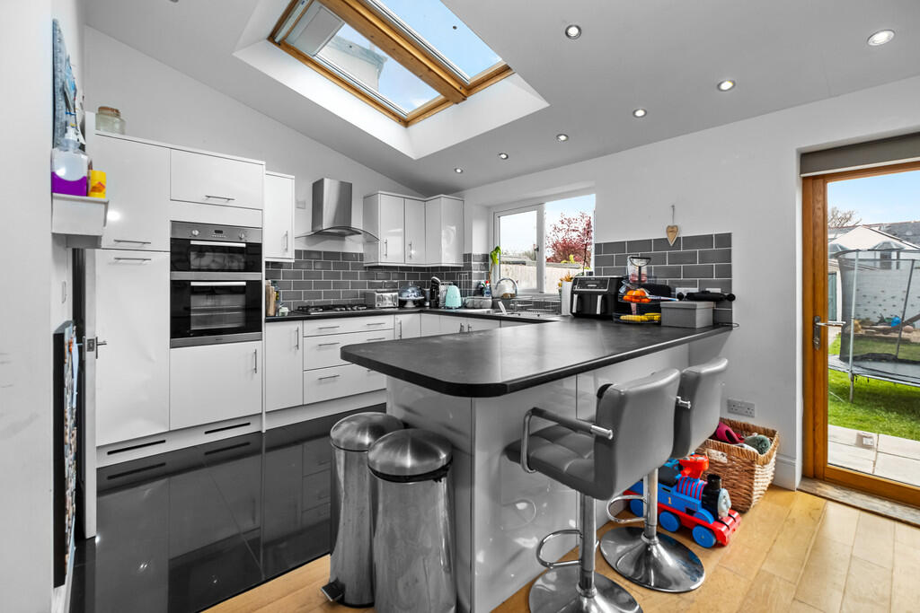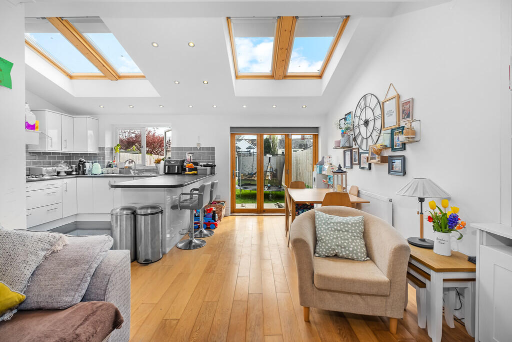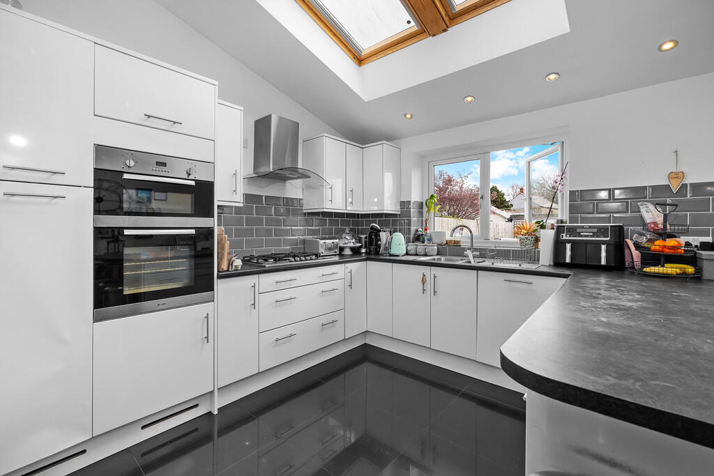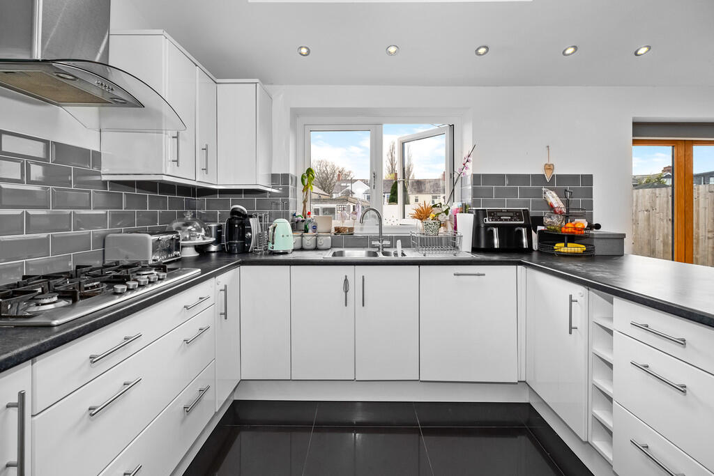 KITCHEN/DINER18' 8" x 10' 4" (5.714m x 3.171m) PVC double glazed window to rear aspect. PVC bifold doors and pvc windows to rear aspect. Spotlights. Radiator. Integral oven and grill, five ring gas hob with extractor fan above. Dishwasher with tiled splashback. Range of base and wall mounted cabinets.