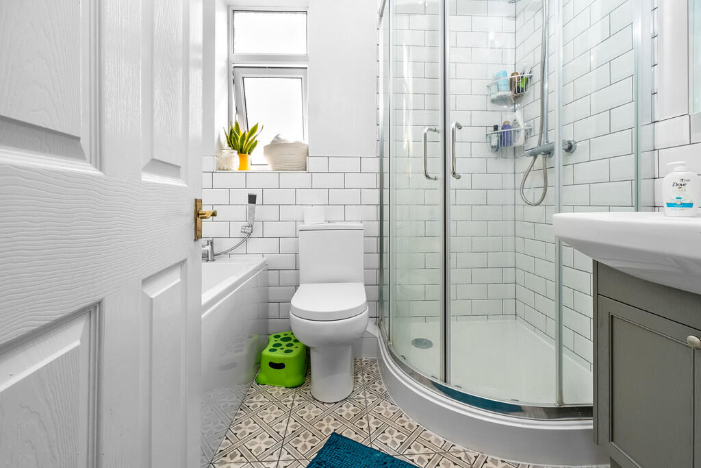 BATHROOM5' 10" x 7' 9" (1.803m x 2.387m) PVC window with obscure glass to rear aspect. Extractor fan. Part tiled walls. Spotlights to ceiling. Bath unit, shower unit, wc with inset flush and wash hand basin. Vanity unit. Ladder style radiator.
