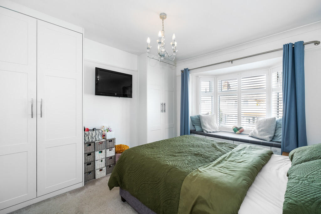 BEDROOMONE10' 6" into alcove x 13' 4"into bay (3.206m x 4.072m) PVC double glazed bay fronted window with shutters. Window seating area with storage below. Coving. Picture rail. Radiator. Two built-in storage cupboards in alcoves.