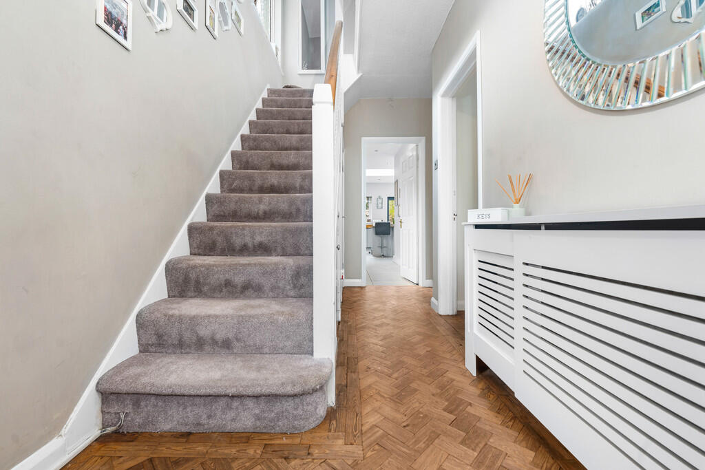 ENTRANCEHALL Enter via wooden obscure glass front door with single glazed window surround. Staircase leading to first floor with under stairs storage cupboard. Smooth walls with textured ceiling and a central light pendant. Original parquet flooring and carpeted staircase. Upvc double glazed window to side. Access into lounge, kitchen and cloakroom.
