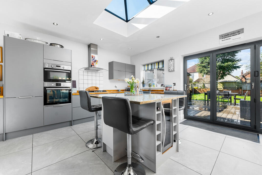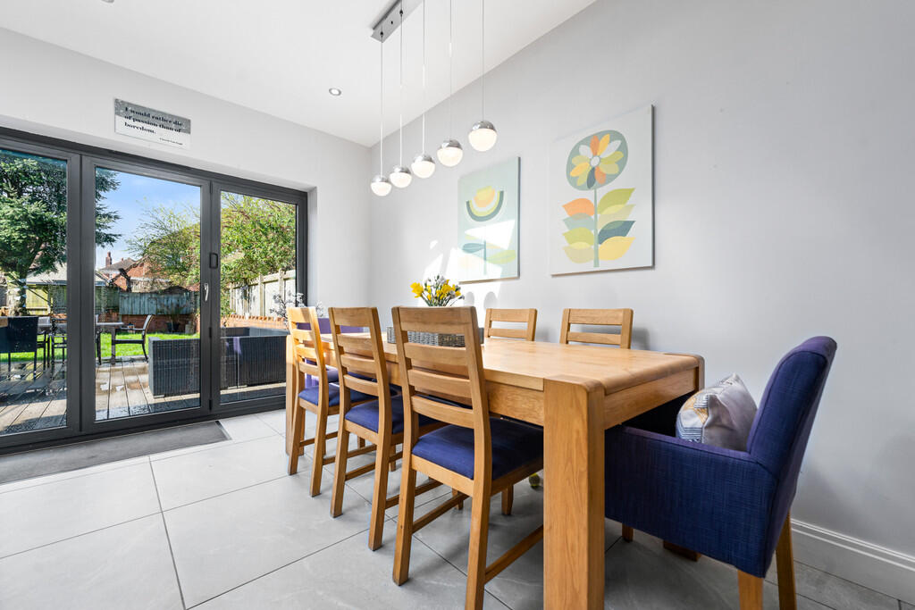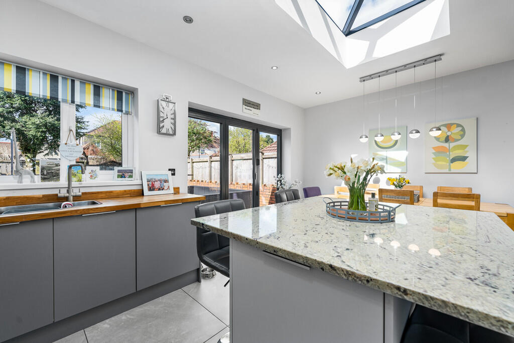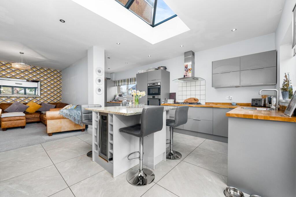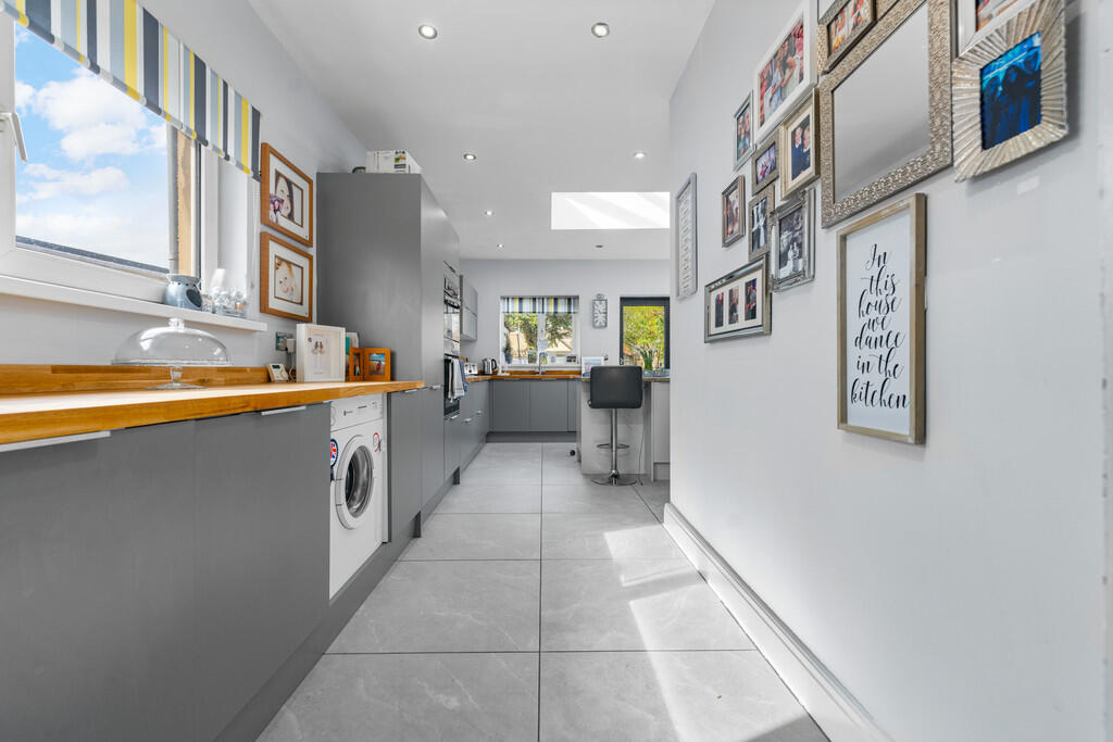 KITCHEN/DININGROOM22' 9" maximum x 17' 4" maximum (6.95m x 5.30m) Fitted with a modern range of base and eye level units with wooden worktops over. Built in double oven and five ring gas hob with cooker hood over. Integral washing machine, fridge/freezer and dishwasher. Mounted one and half bowl sink unit. Central kitchen island with storage finished with a granite worktop. Space for large family sized dining table and chairs. Upvc double glazed window to side and rear with aluminium bi folding doors leading to rear garden. Smooth walls and ceiling with spot lighting and roof lantern and finished with tiled flooring.