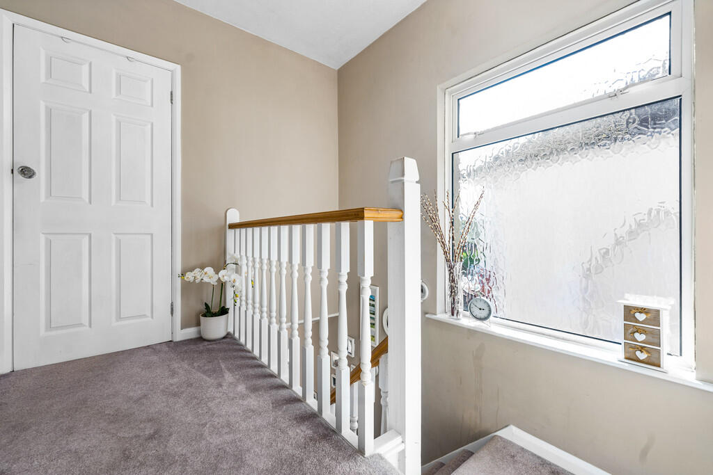 LANDING Smooth walls with textured ceiling and central light pendant finished with carpeted flooring. Upvc double glazed window to side. Access leading into all first floor rooms. Loft hatch providing access to loft space.