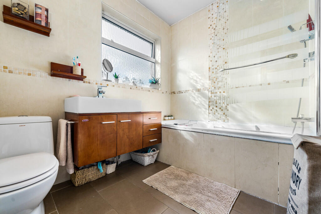 BATHROOM Fitted with a modern three piece bathroom suite comprising bath with shower over, WC and wash hand basin with built in storage. Tiled walls and flooring with smooth ceilings and spot lighting. Upvc double glazed obscure window to side.