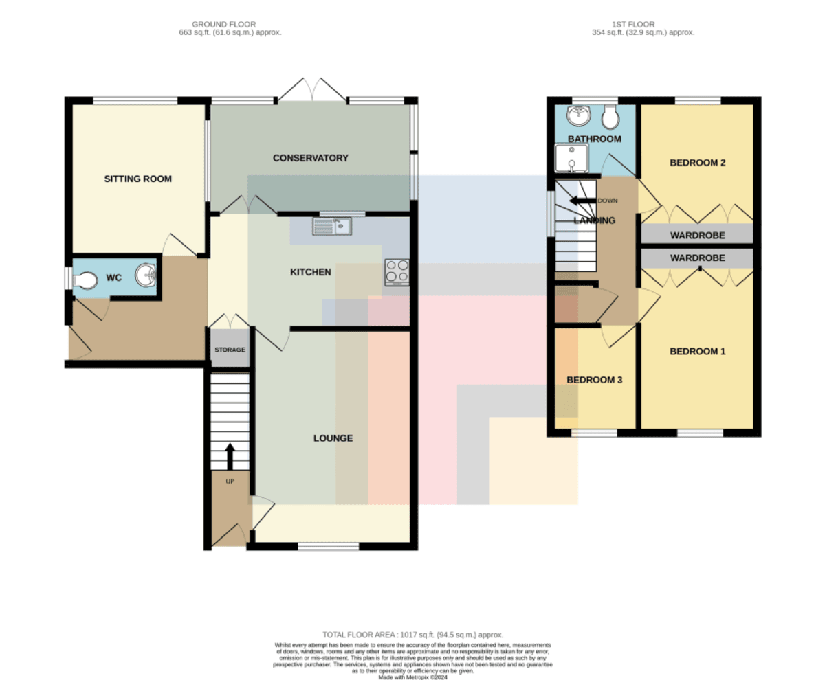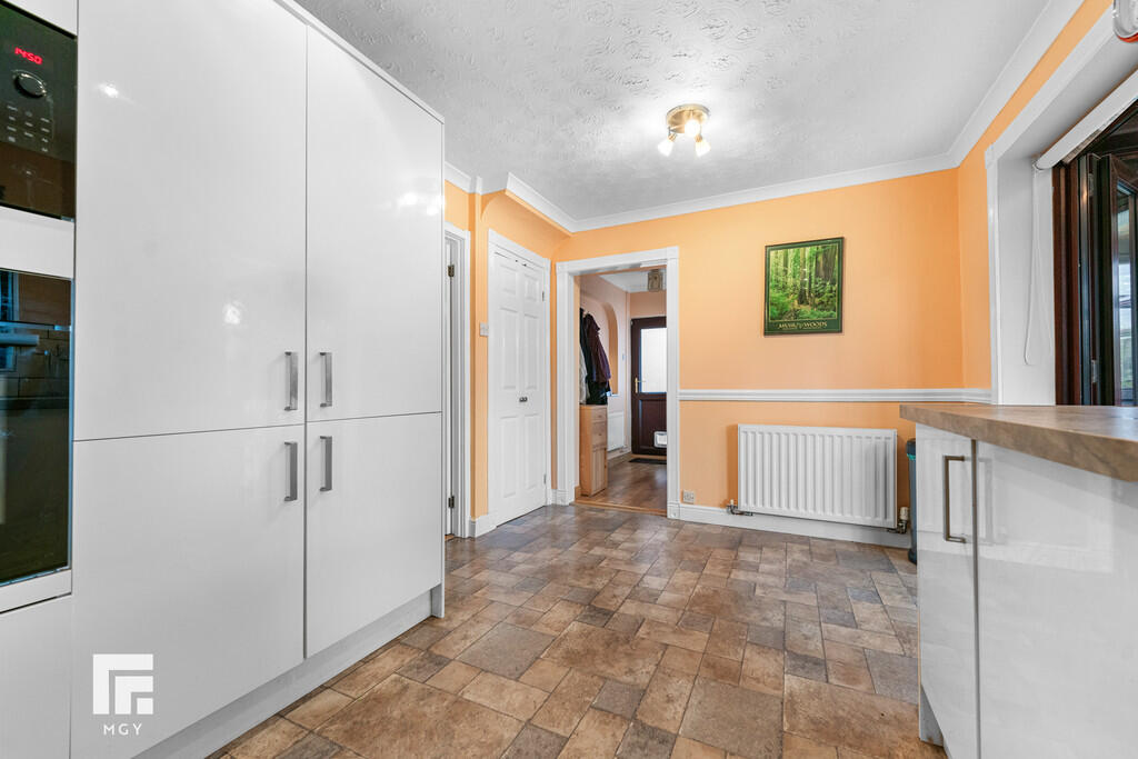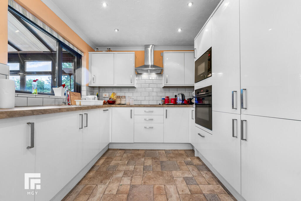 KITCHEN/DINER15' 5" x 9' 3" (4.70m x 2.82m) A modern kitchen fitted with a wide range of base and eye level units incorporating stainless steel sink and drainer with complementary work surfaces. Fitted electric oven, microwave and hob with extractor hood over. Integrated fridge/freezer, dishwasher and washing machine. Cupboard housing gas central heating boiler. Tiled slash backs. Spotlights. Radiator. Under stair storage cupboard. uPVC double glazed window and French doors to conservatory. Opening to lobby with doors to WC, sitting/dining room, and external door to side. Radiator. Laminate wood flooring.