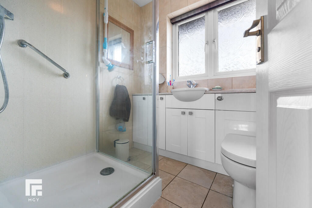 BATHROOM5' 10" x 5' 5" (1.80m x 1.66m) Vanity enclosed wash hand basin and WC. Fitted shower cubicle with glass screen, rain shower head and separate attachment. Tiled flooring. Part panelled and tiled walls. Ladder radiator. uPVC double glazed window to rear.