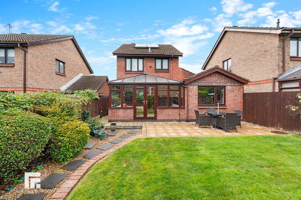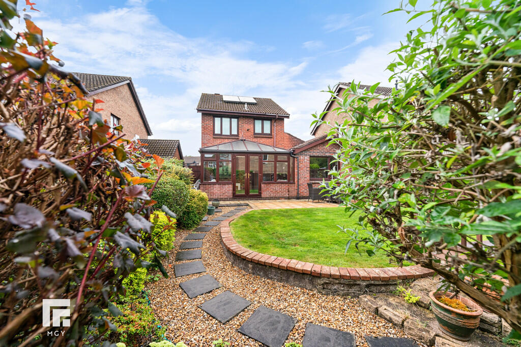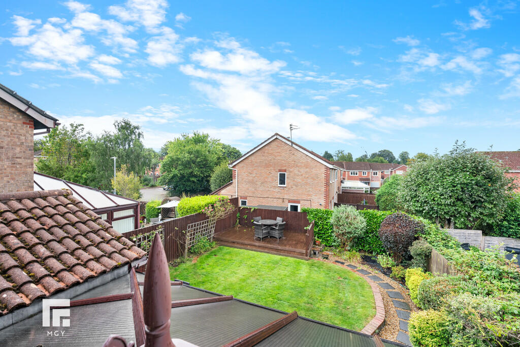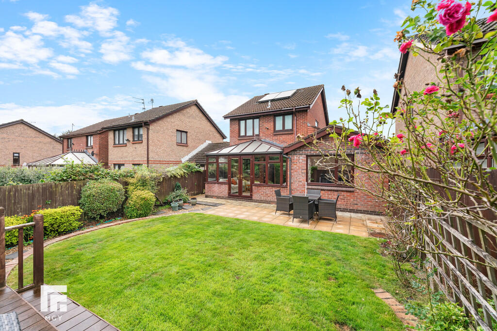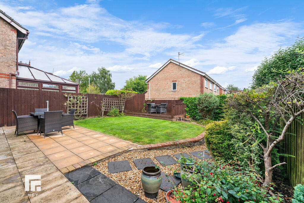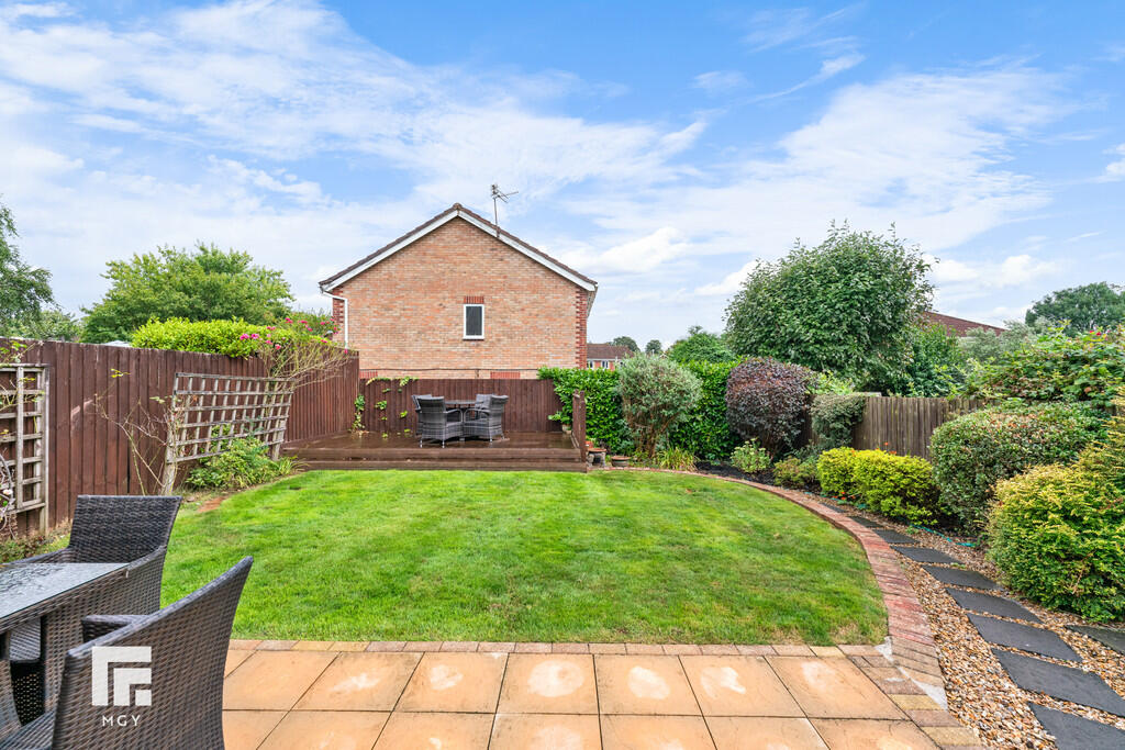 REARGARDEN A beautifully presented rear garden mainly laid to lawn with paved patio and raised decking. Mature hedge border. Boundary fence. Outside tap to side. External power points.