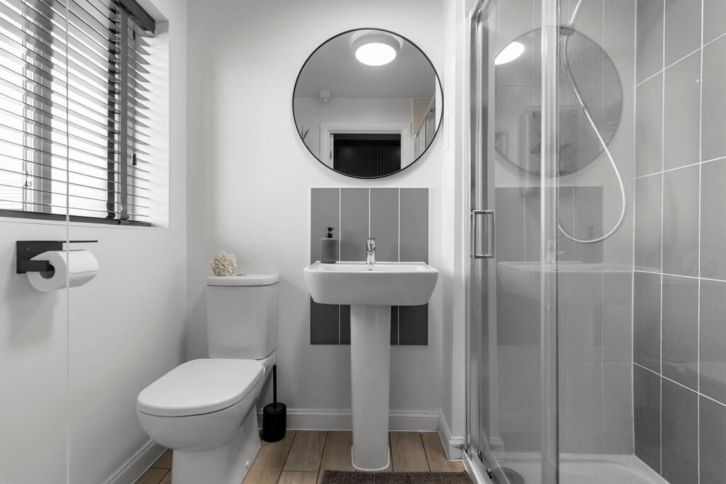 ENSUITE Double glazed opaque window to the rear. Continuation of flooring. Closed cistern w.c, wash hand basin and glazed shower enclosure with shower in situ. Radiator.