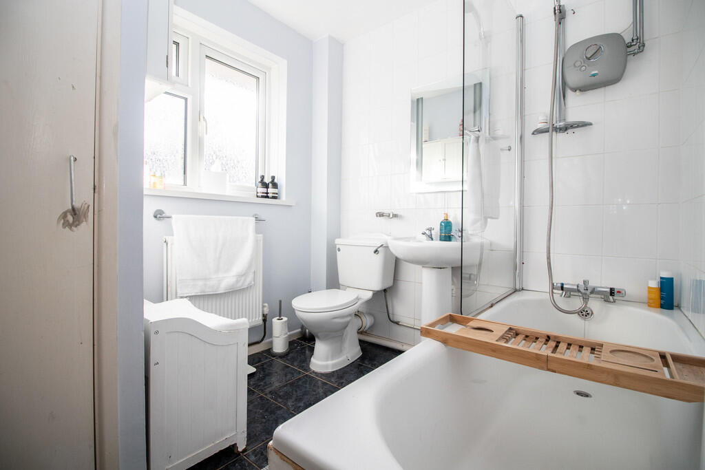 FAMILYBATHROOM8' 1" x 6' 11" (2.48m x 2.13m) Comprising low level wc, wash hand basin, panelled bath with shower mixer tap, swivel shower screen, tiled flooring, wall tiling to splash back areas, obscure glass window to rear, radiator and airing cupboard with shelving housing the ideal logic combi gas central heating boiler.